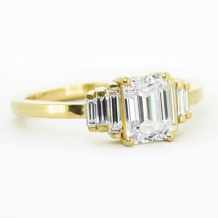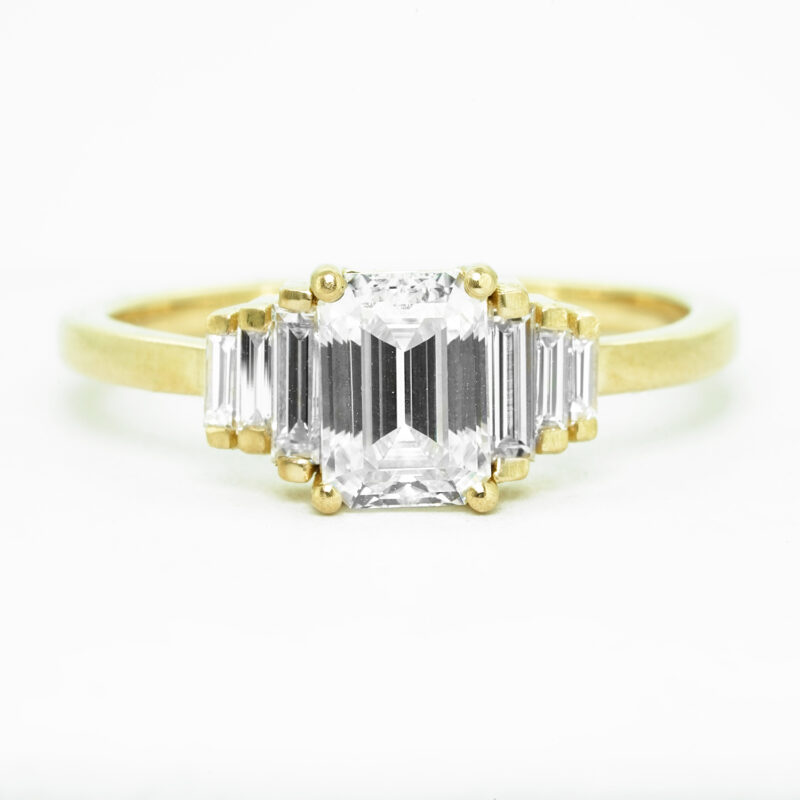 This brand new stunning ring features a central Emerald cut Moissanite, set with 6 graduated baguette cut lab grown diamonds set in a gorgeous art deco inspired mount!
