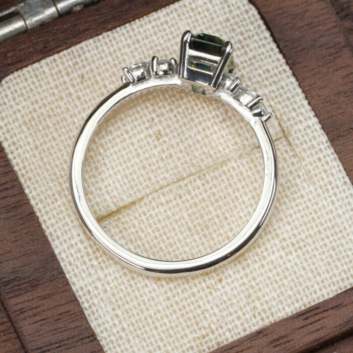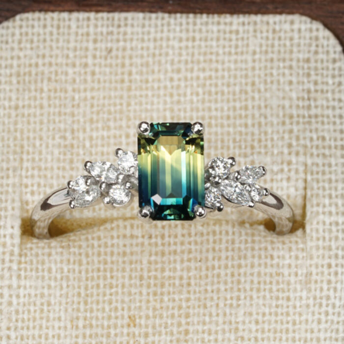 Centre Sapphire: 1.56ct, emerald cut, 7.9×5.1×3.8mm, VS clarity, green-blue-yellow