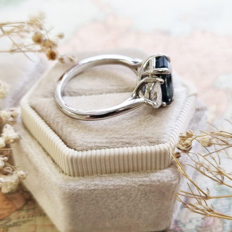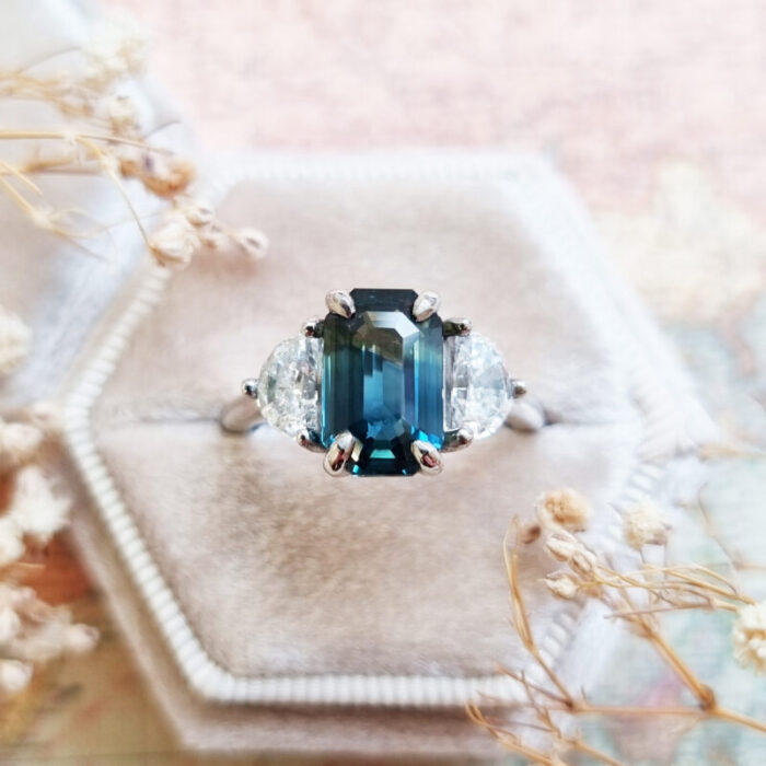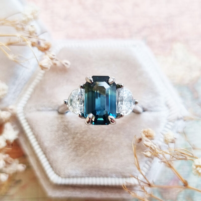 This truly special ring features a central natural 4.05ct emerald cut parti Sapphire displaying individual hues of blue, green and yellow. It is set with two unique half moon cut lab grown diamonds in a bespoke antique inspired platinum mount!