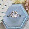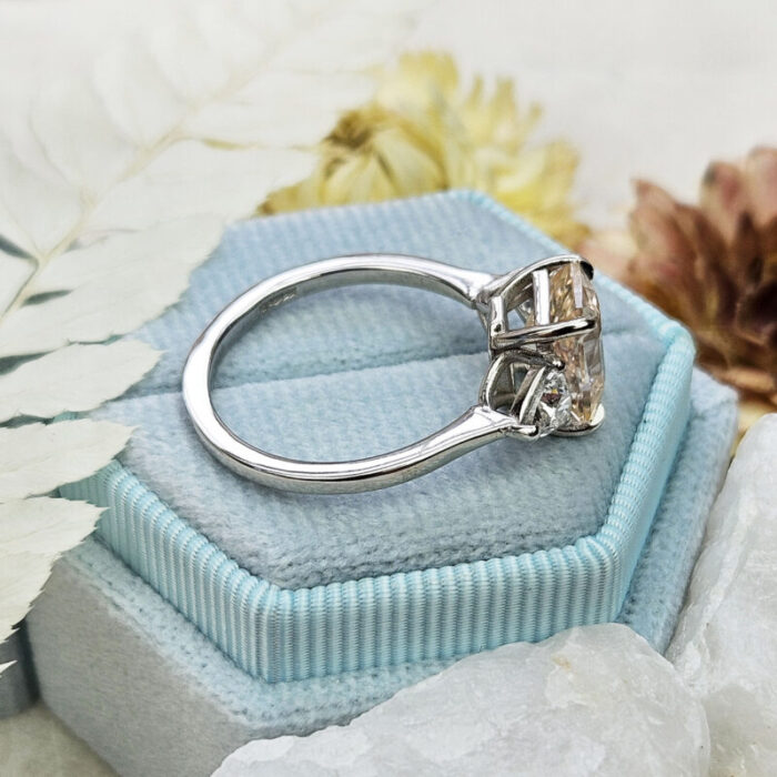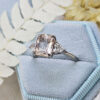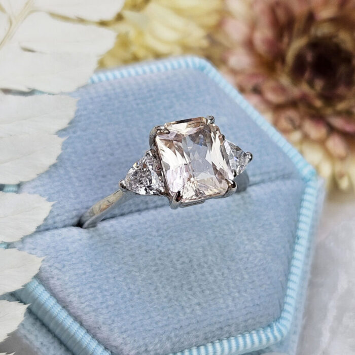 This brand new stunning ring features a central 3.59ct radiant cut natural peach sapphire, flanked by two trillion cut lab grown diamonds in a stunning low profile platinum trilogy mount!