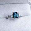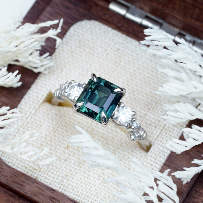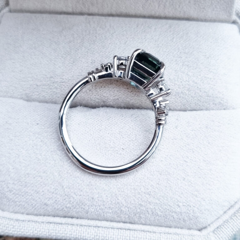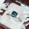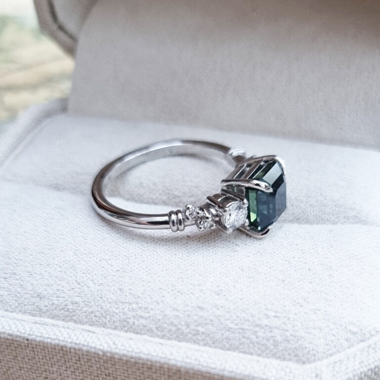 This brand new stunning ring features a central natural 3.24ct emerald cut teal sapphire, that has been set with an asymmetric cluster of lab grown diamonds running down the low profile platinum band!