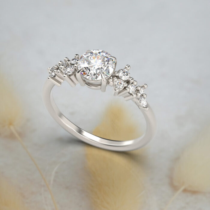 This beautiful features a central round brilliant cut grown diamond. It is talon set with a mixture of round and marquise cut diamonds in an enchanting, low profile, floral inspired platinum mount!