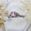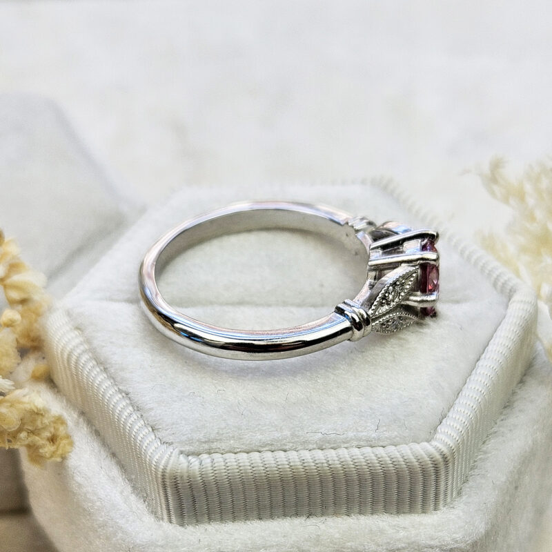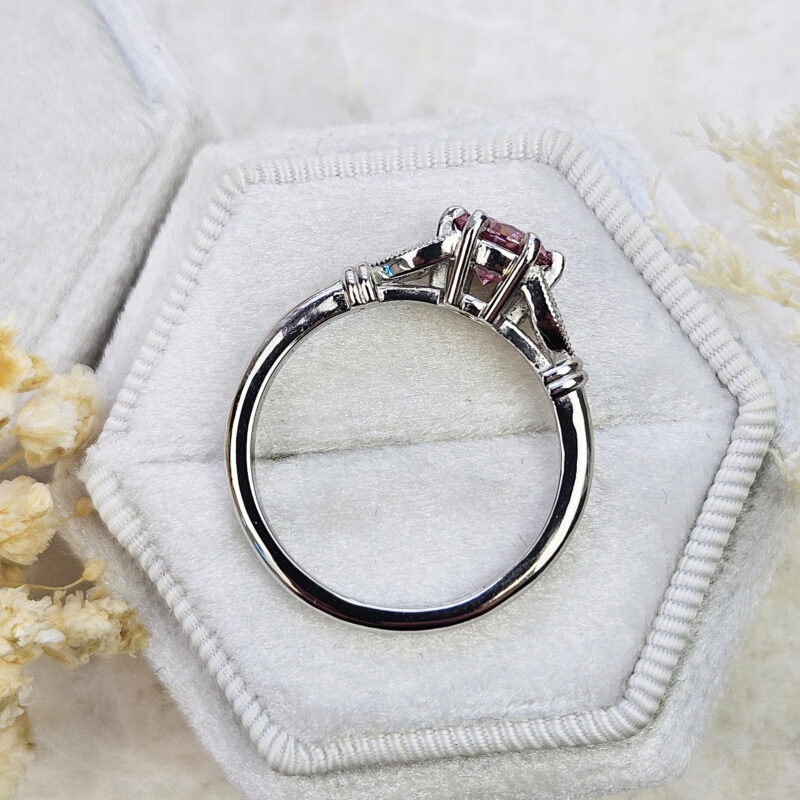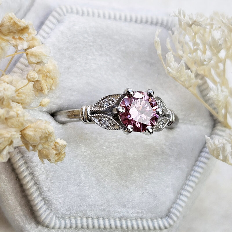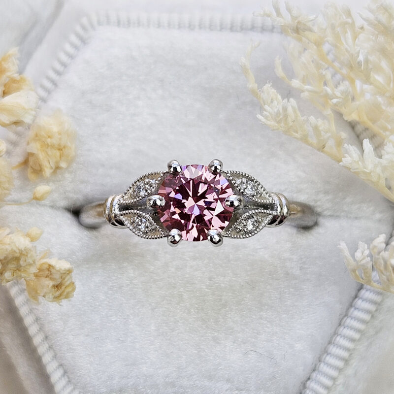 This brand new stunning ring features a central round lab grown pink diamond, set in a gorgeous antique inspired floral platinum mount, with 4 white diamond accent stones!