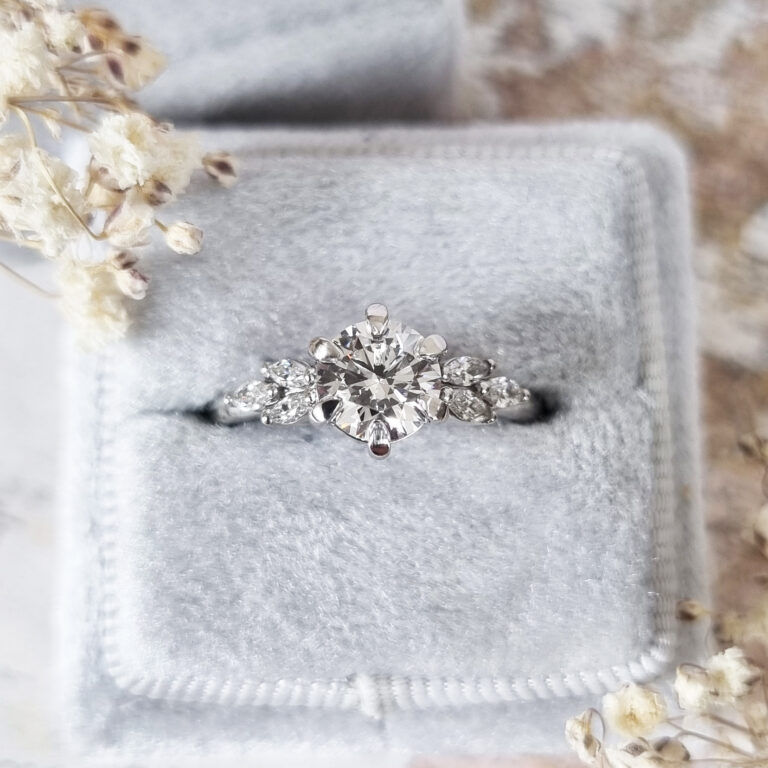 This brand new ring features a central 1ct carat round brilliant cut lab grown diamond, that has been set with 6 marquise cut matching diamonds in a floral inspired platinum low profile mount!