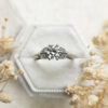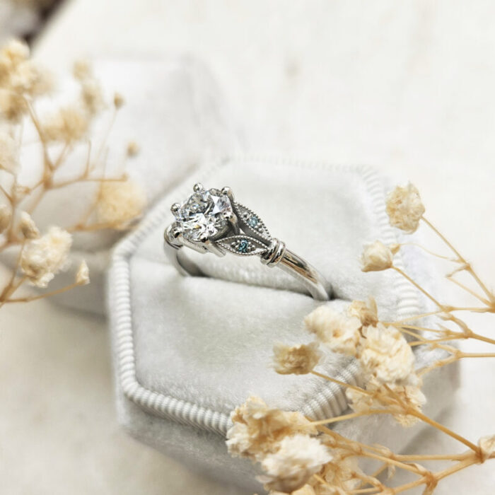This brand new stunning ring features a central round lab grown diamond, set in a gorgeous antique inspired floral platinum mount, with 4 aqua blue diamond accent stones!