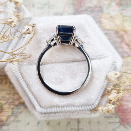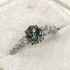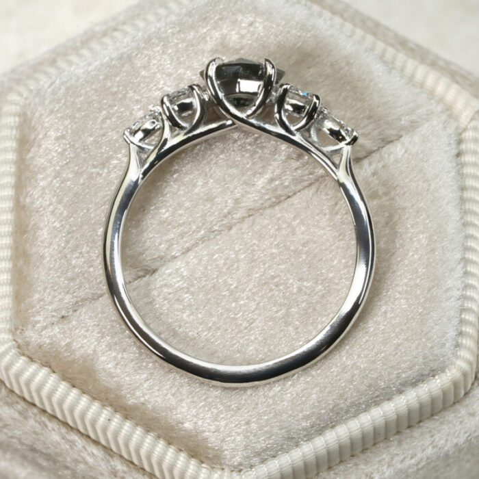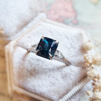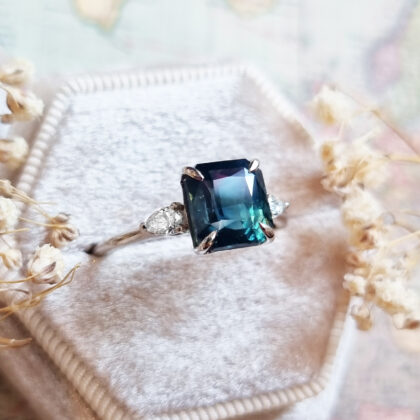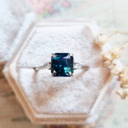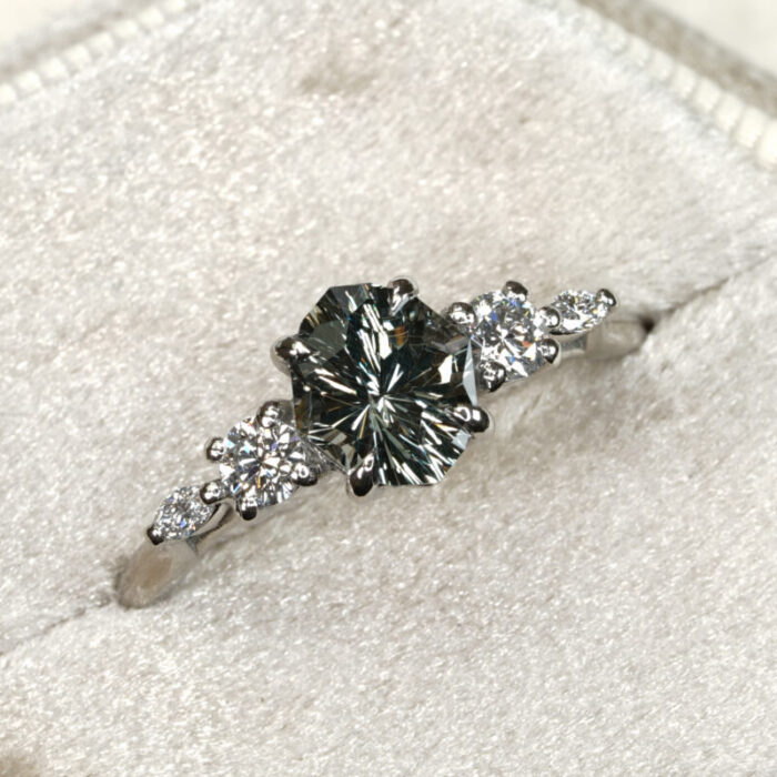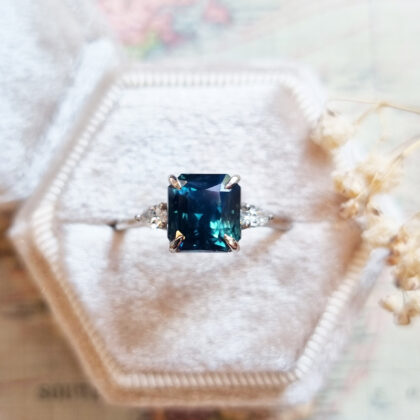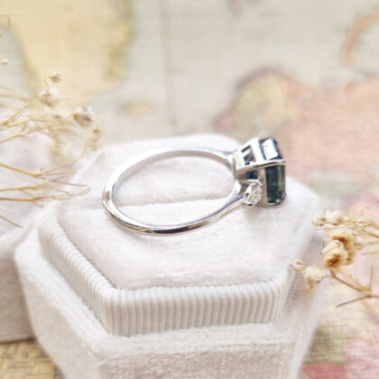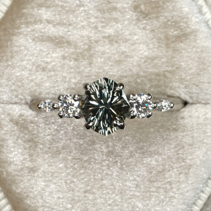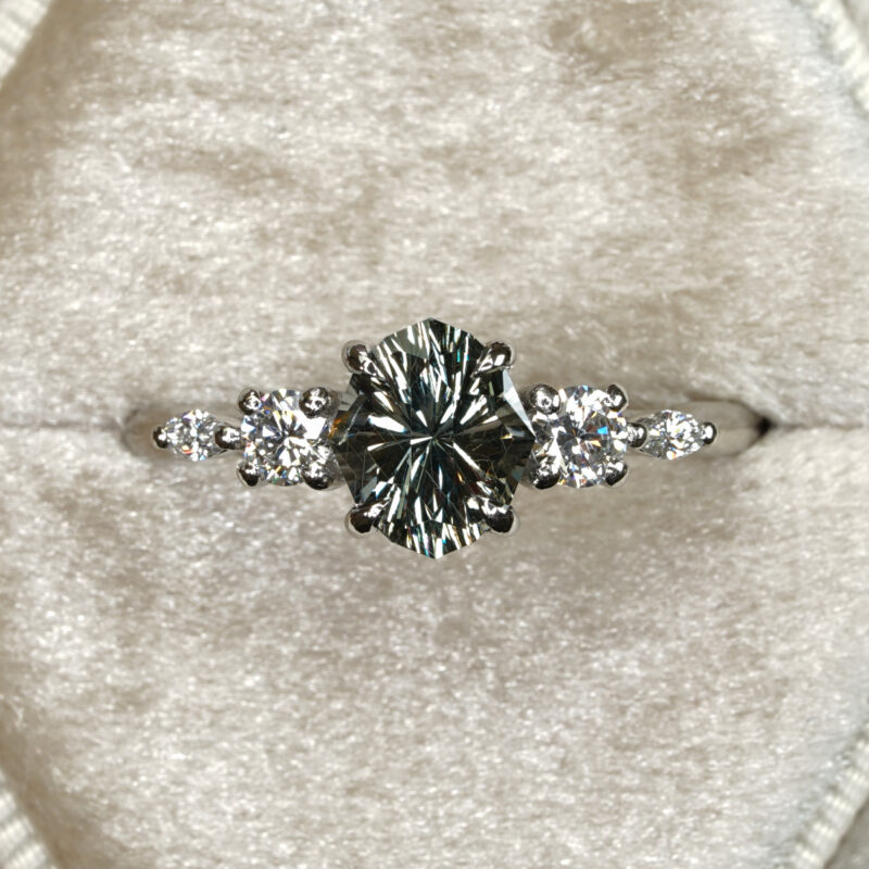 This brand new stunning ring features a beautiful and totally unique 1.3ct natural steely seafoam green sapphire. This sapphire was cut by artist and master lapidary Sennin Esko in his one of a kind ‘Galaxy’ style dodecagon cut. The sapphire has been 4 talon set with two round brilliant and two marquise lab diamonds in a weaving trellis style setting!
