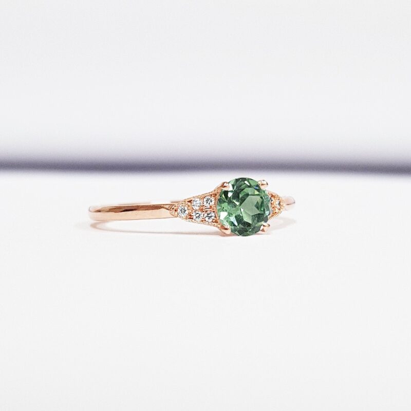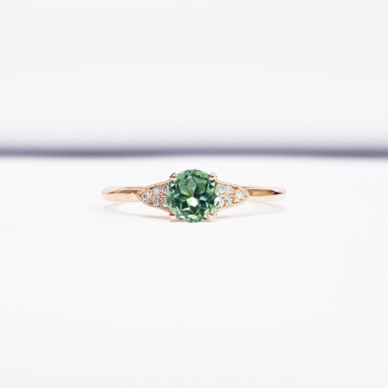 This brand new stunning ring features a central brilliant cut lab grown green sapphire, set in a stunning antique 1920s inspired mount, with accent diamonds.