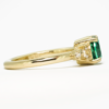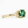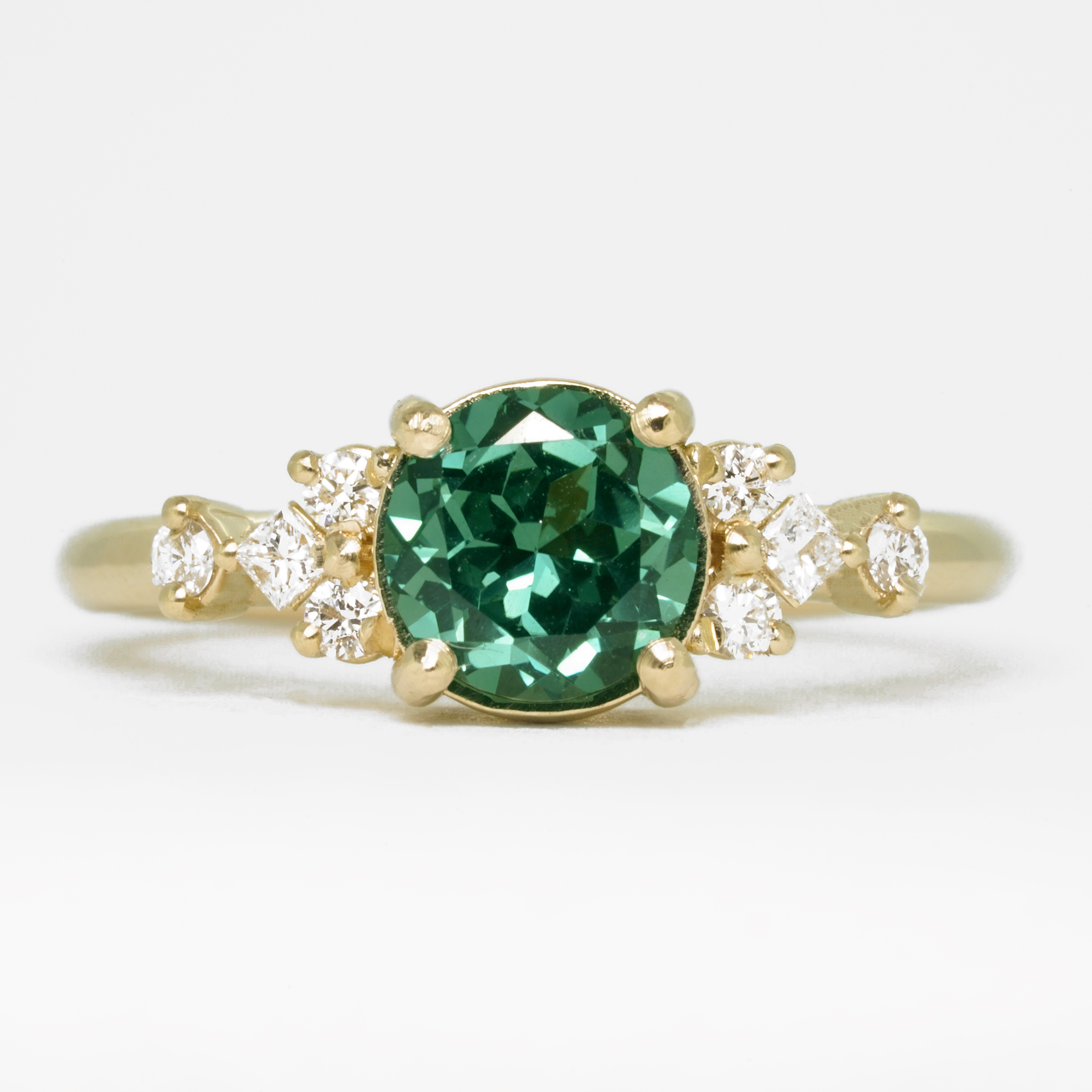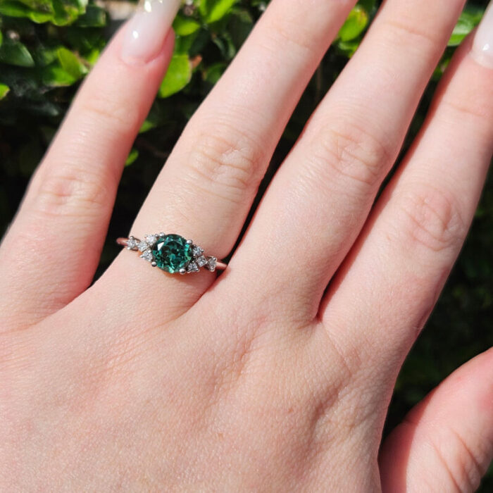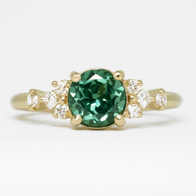 This brand new stunning ring features a central lab created green sapphire, set in a stunning delicate mount that has been claw set by 6 brilliant cut and 2 princess cut diamonds!