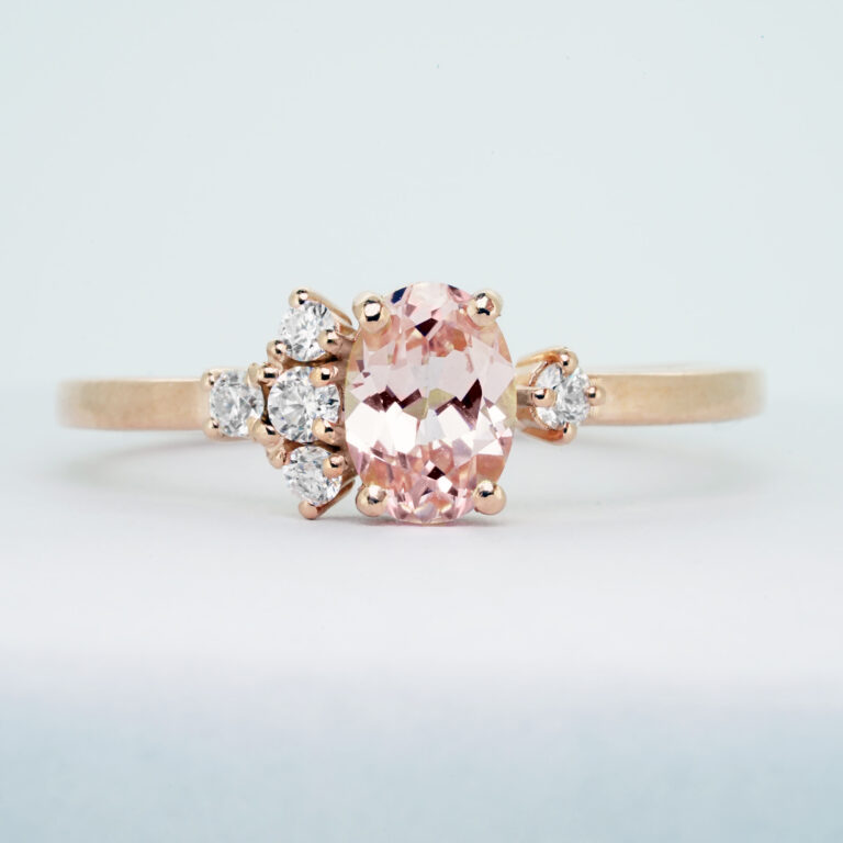This brand new stunning ring features a central lab created oval cut champagne Sapphire, set in a stunning asymmetrical mount that has been decorated with 5 brilliant cut diamonds!