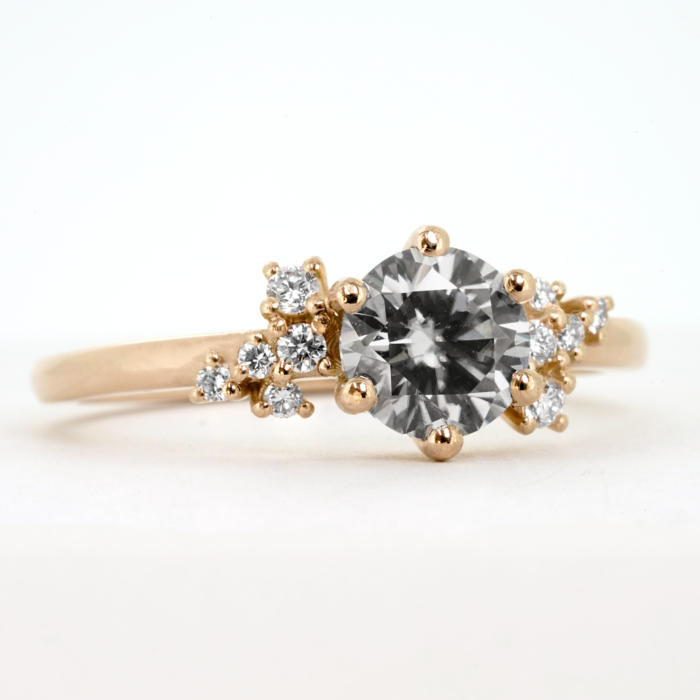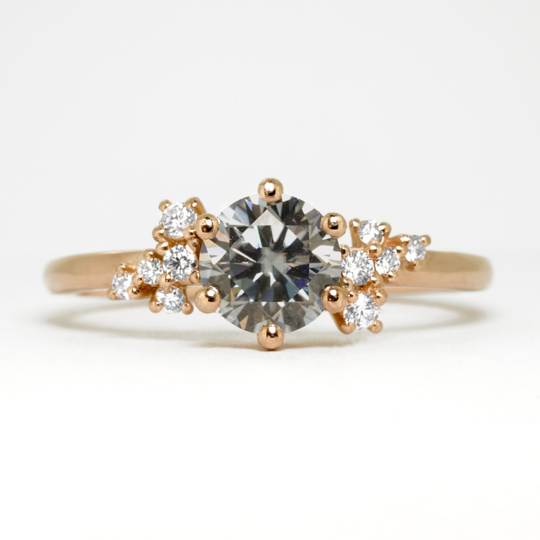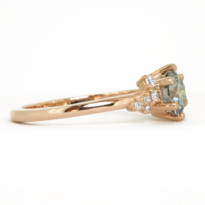 This brand new stunning ring features a central round brilliant cut fancy Grey Moissanite, flanked by 10 brilliant cut diamonds in a stunning floral inspired mount!