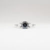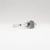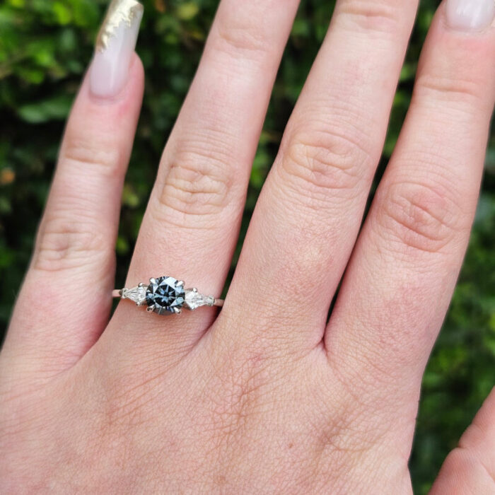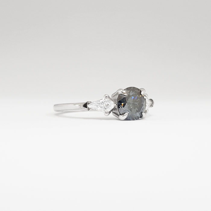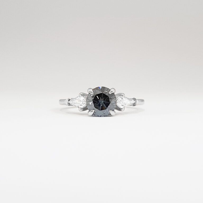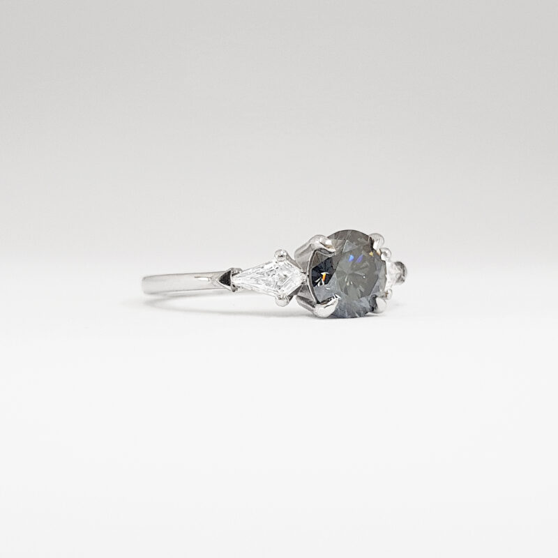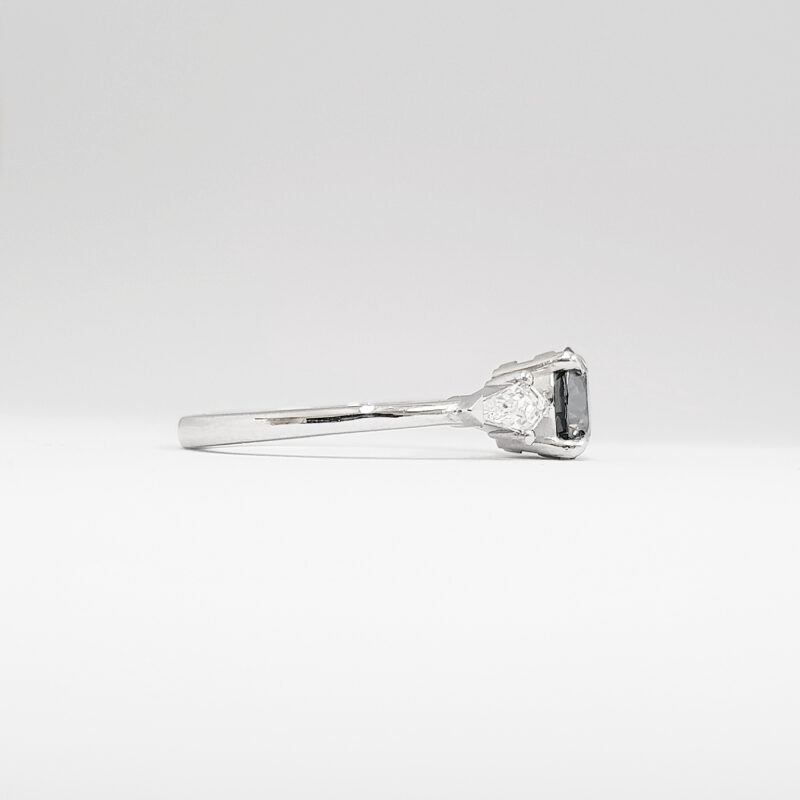 This brand new stunning ring features a central round midnight grey Moissanite, flanked by two stunningly unique kite cut moissanites in a trilogy mount!