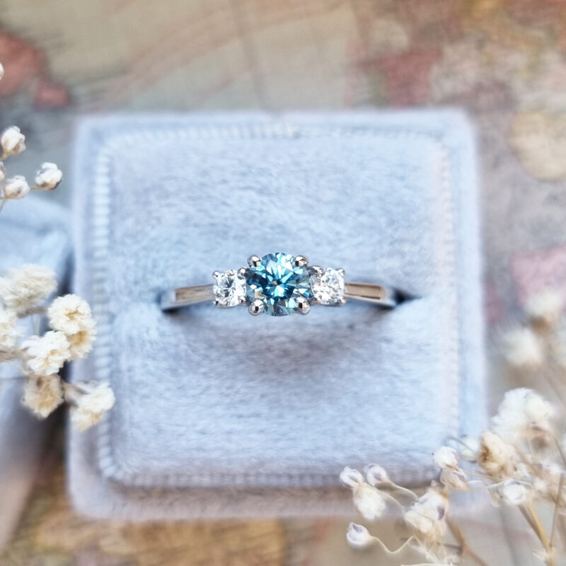 Center lab grown blue diamond: 0.5ct, fancy vivid blue, VS1 clarity, IGI certified (this is the minimum size and quality, if the diamond is sourced at a higher size/quality then no extra charge will be added)
