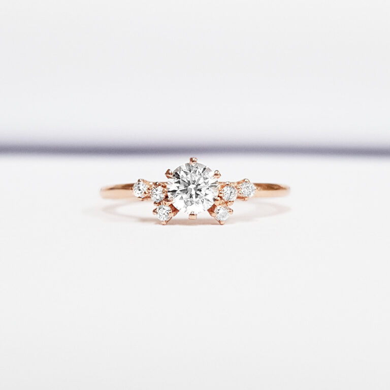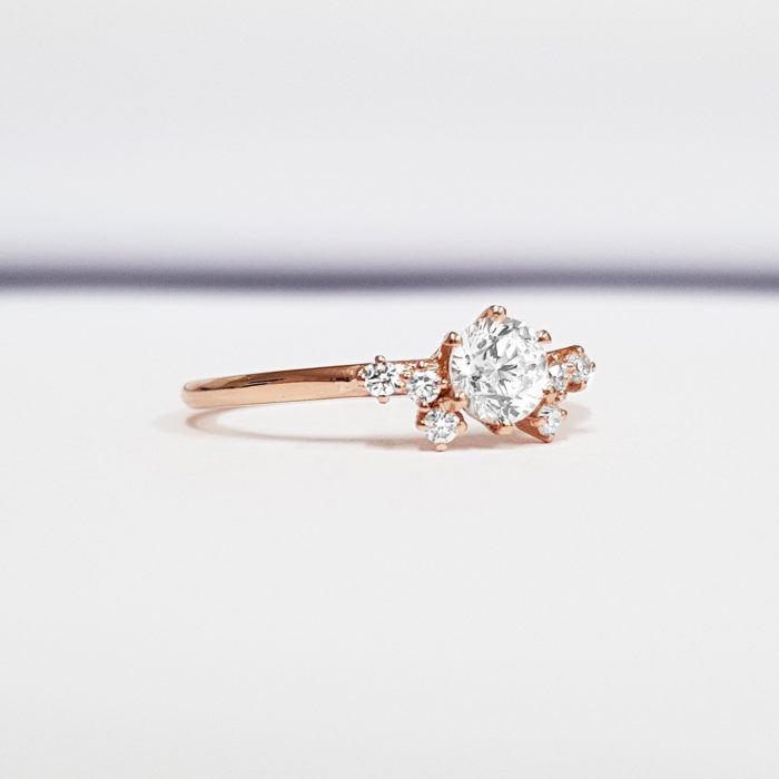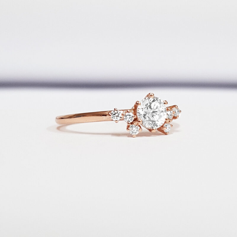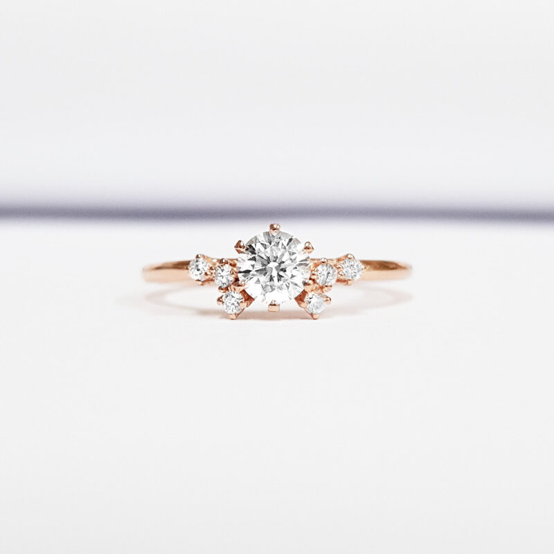 This brand new stunning ring features a central brilliant cut lab grown diamond, that has been claw set with 6 brilliant cut grown diamonds, in a sleek and elegant low profile mount.