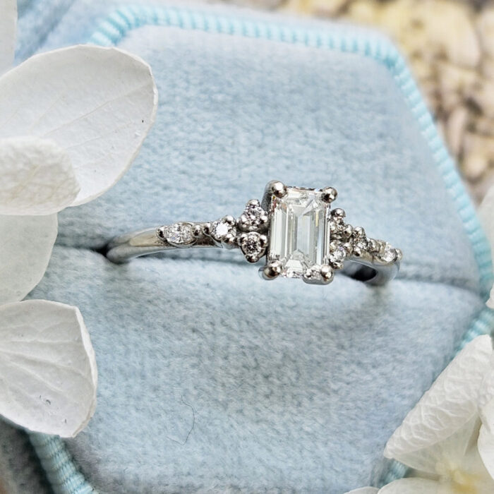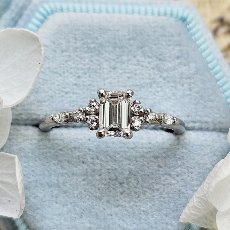 This brand new ring features a central 0.5 carat, E colour, VS1 clarity lab grown round brilliant cut diamond. It has been set in a beautiful floral inspired, low profile platinum mount!