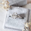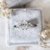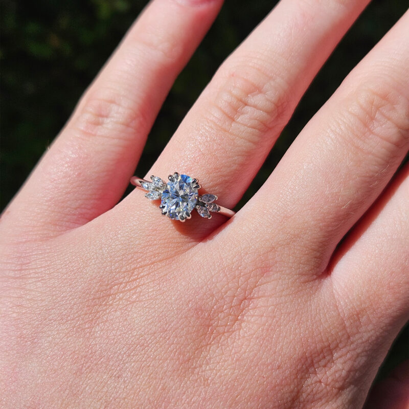 This brand new ring features a central 1.2 carat, D colour, VS1 clarity lab grown oval cut diamond. It has been set with 6 marquise diamonds, in a beautiful floral inspired, low profile platinum mount!