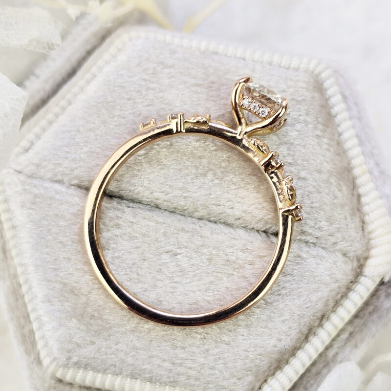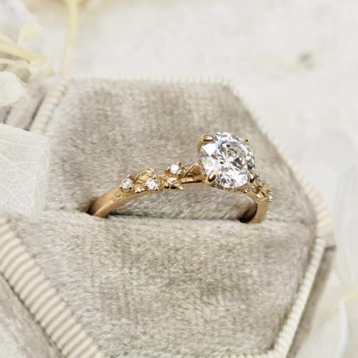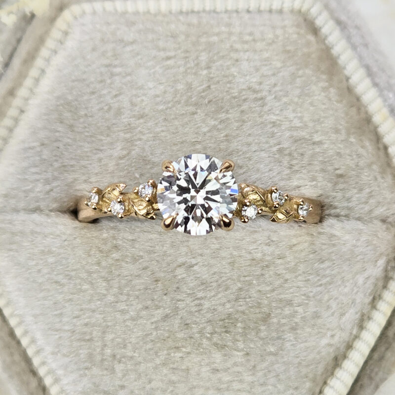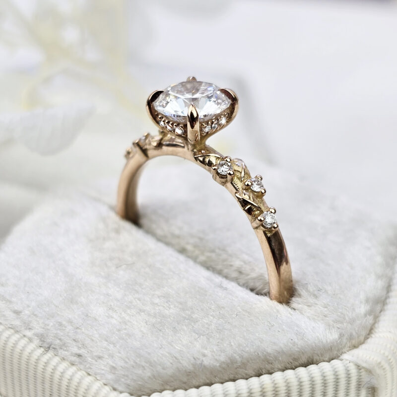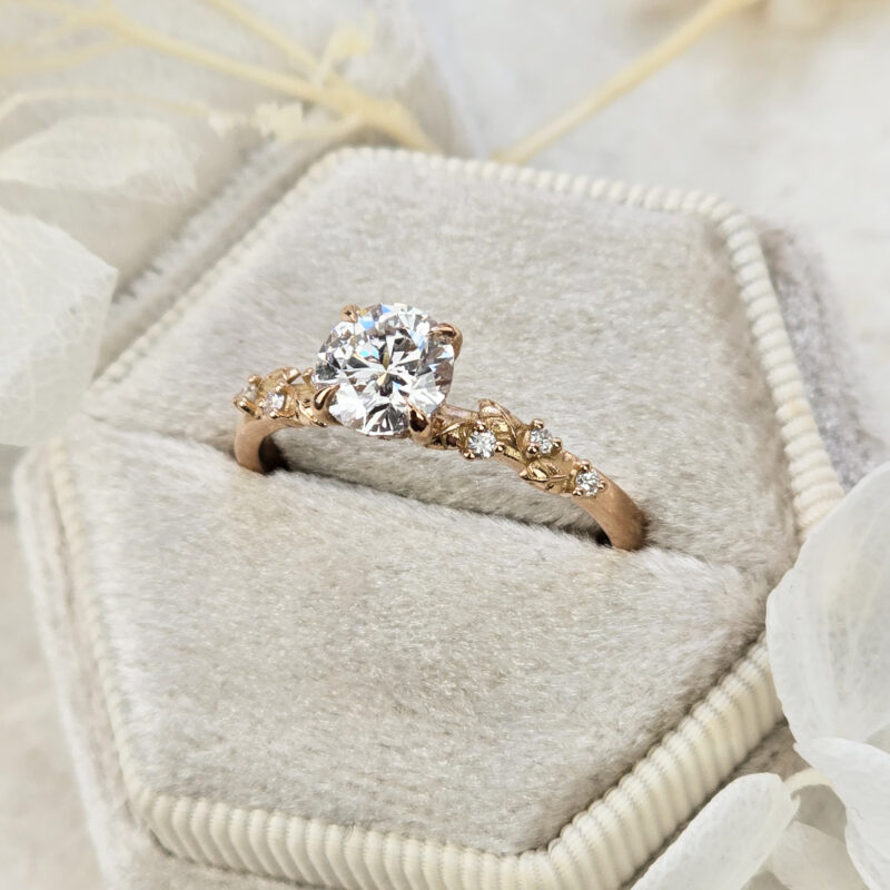 This elegant ring features a central 1ct round brilliant cut lab grown diamond, in a 4 talon setting. The central diamond is accented with a mixture of miniature leaves and round diamonds, with an additional secret hidden halo of diamonds all in 18ct rose gold!