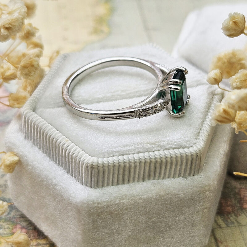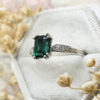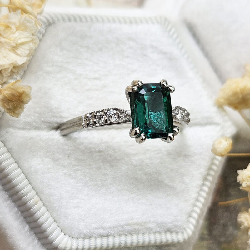 This brand new stunning ring features a central lab grown intense green emerald that has been double prong set in platinum. The shoulders features 6 round brilliant cut diamonds with milgrained detail, giving the ring a subtle antique aesthetic.