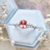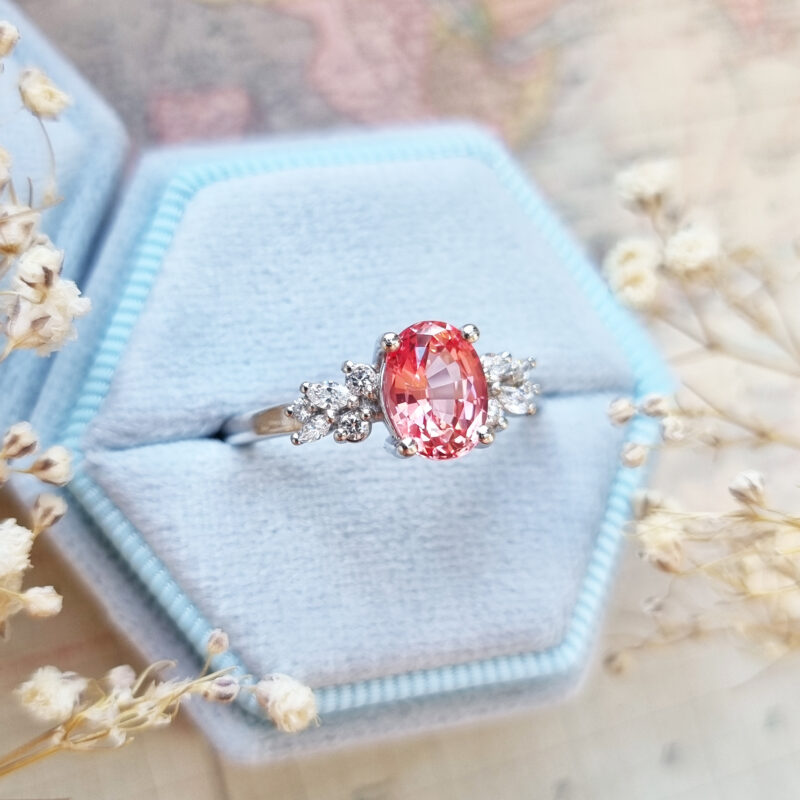 This brand new ring features a mesmerizing oval cut Chatham padparadscha sapphire, set with a mixture of marquise and round cut diamonds in a flowing, floral inspired pattern. The ring is designed to be low profile from the finger.