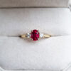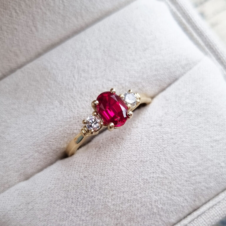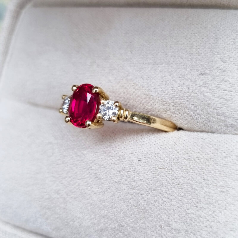 This brand new stunning ring features a central oval cut intense red lab grown ruby, flanked by two brilliant cut lab grown diamonds in a stunning low profile trilogy mount!