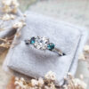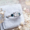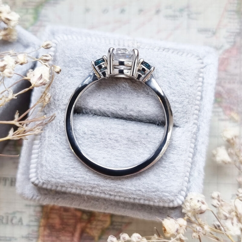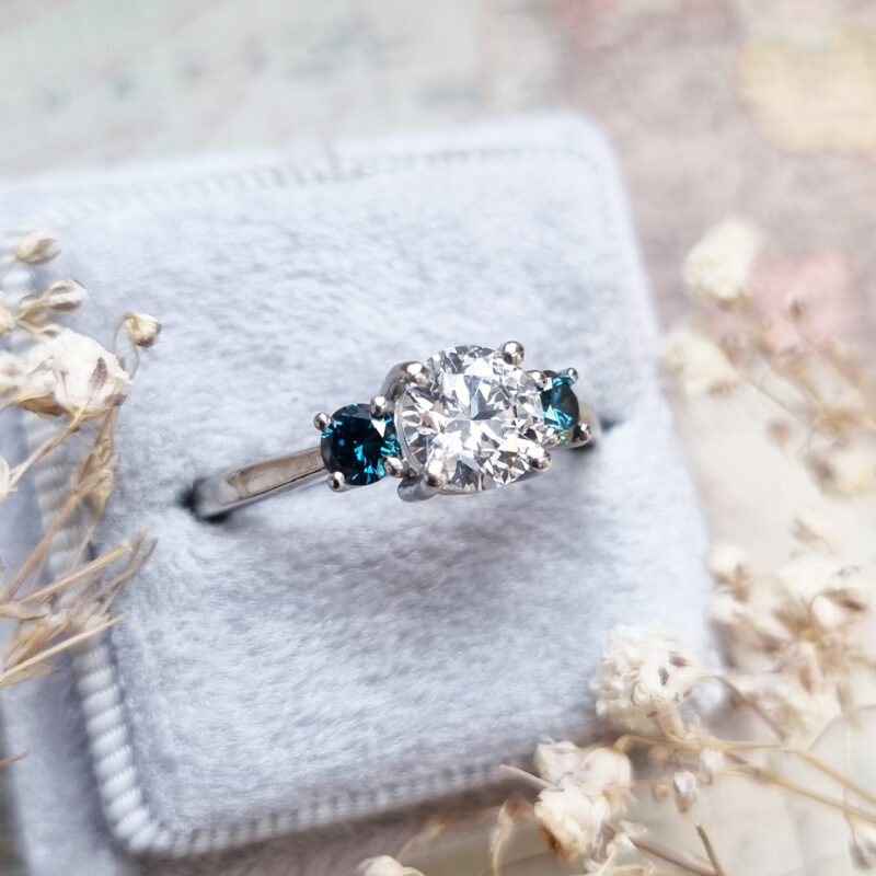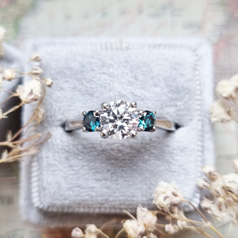 This brand new stunning one-off ring features a central 1 carat brilliant cut white diamond, flanked by two teal diamonds, in a bespoke platinum mount!