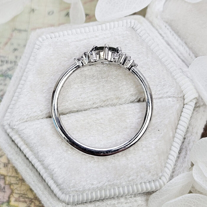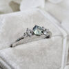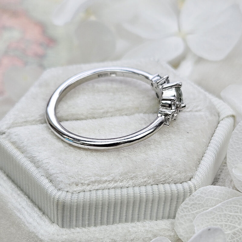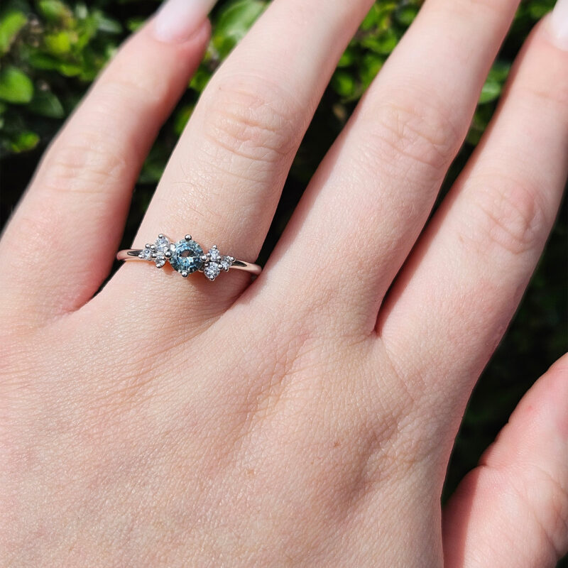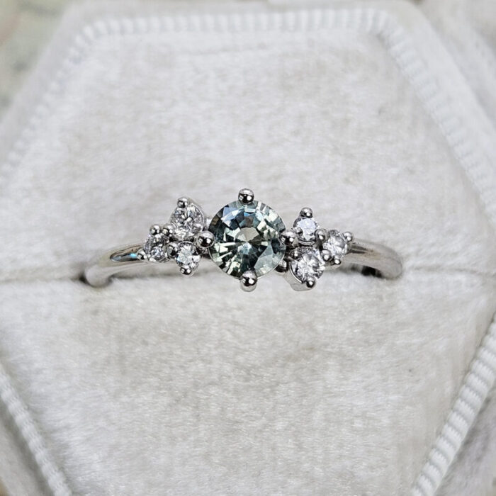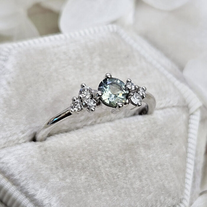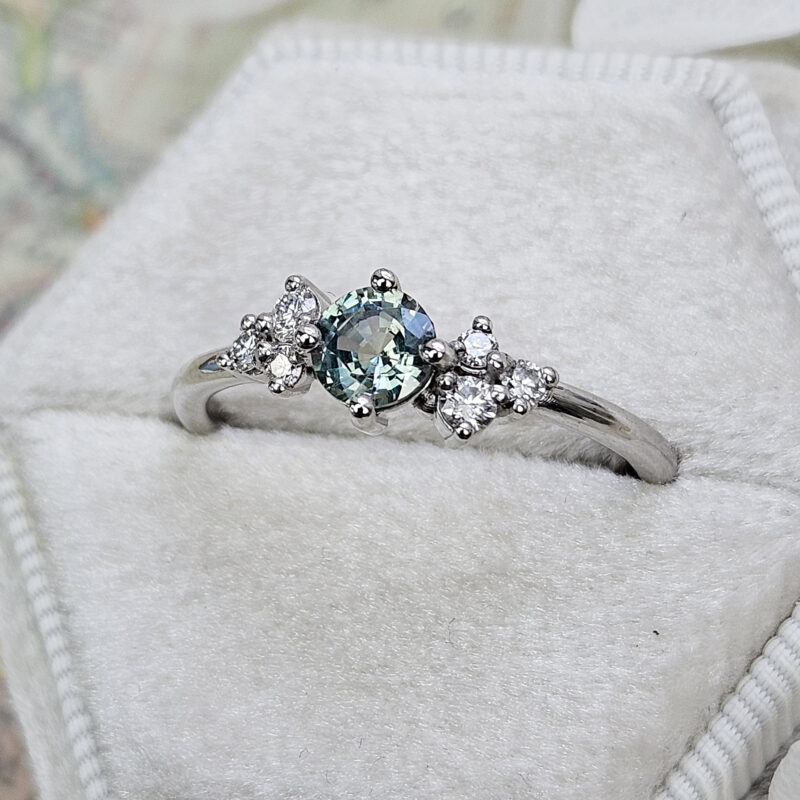 This brand new stunning ring features a central round cut lab grown seafoam green Sapphire, that has been prong set with 6 brilliant cut diamonds, in a sleek and elegant low profile mount.