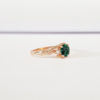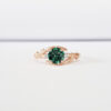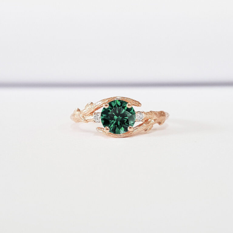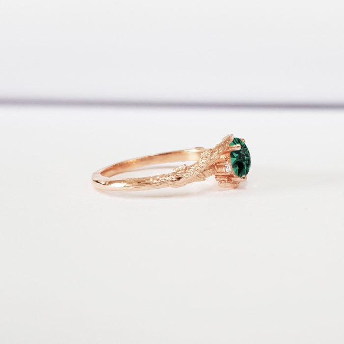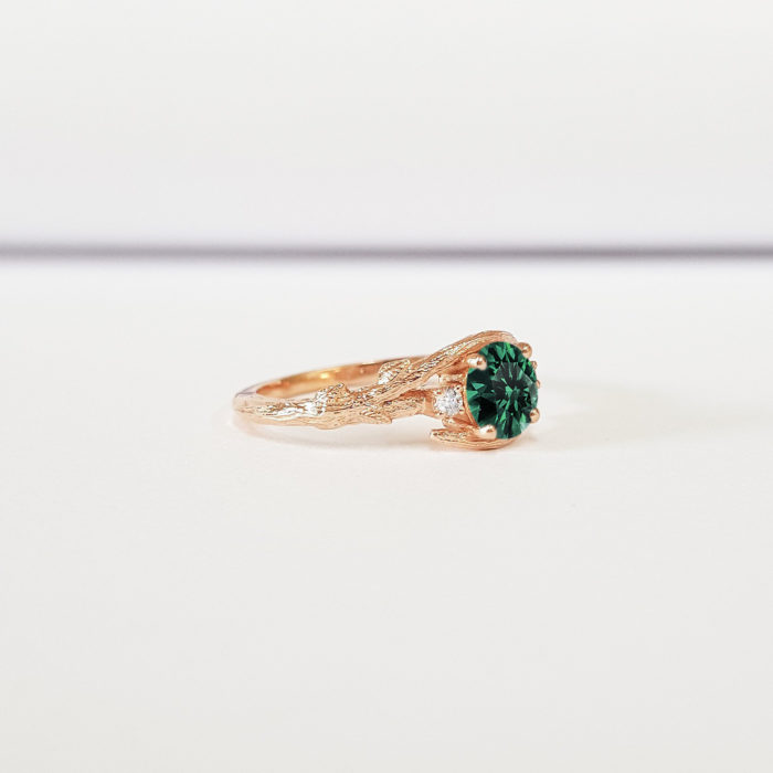 This brand new stunning ring features a central brilliant cut lab grown green sapphire, flanked by two diamonds and set in a custom tree mount with tiny golden leaves!