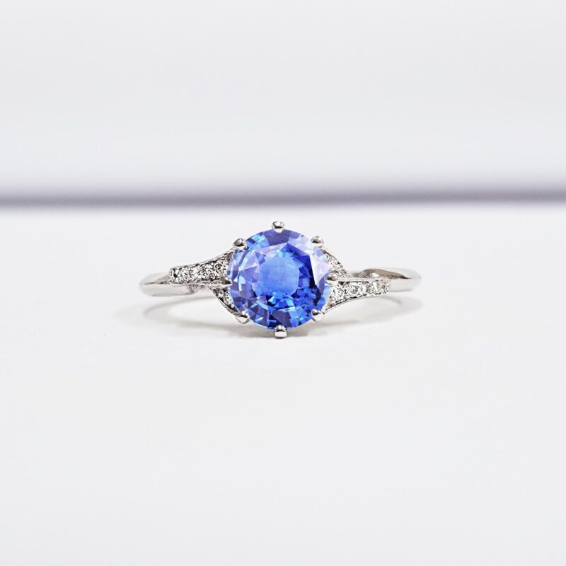 This brand new stunning ring features a central 1 carat lab grown light blue sapphire, set in a stunning antique 1920s inspired mount that has been studded with a further 10 diamonds!