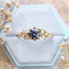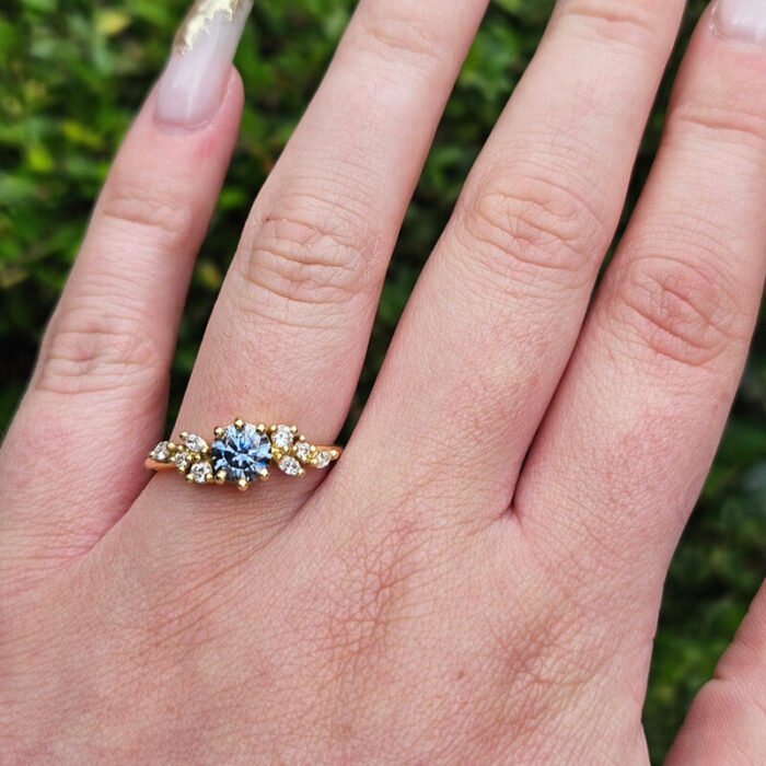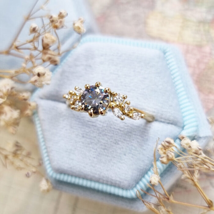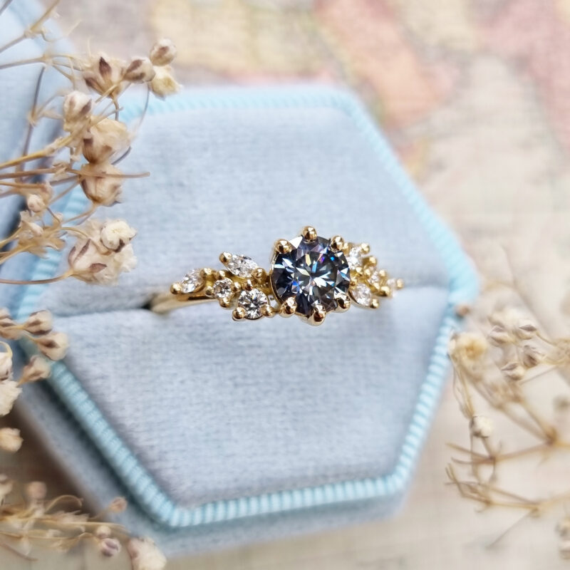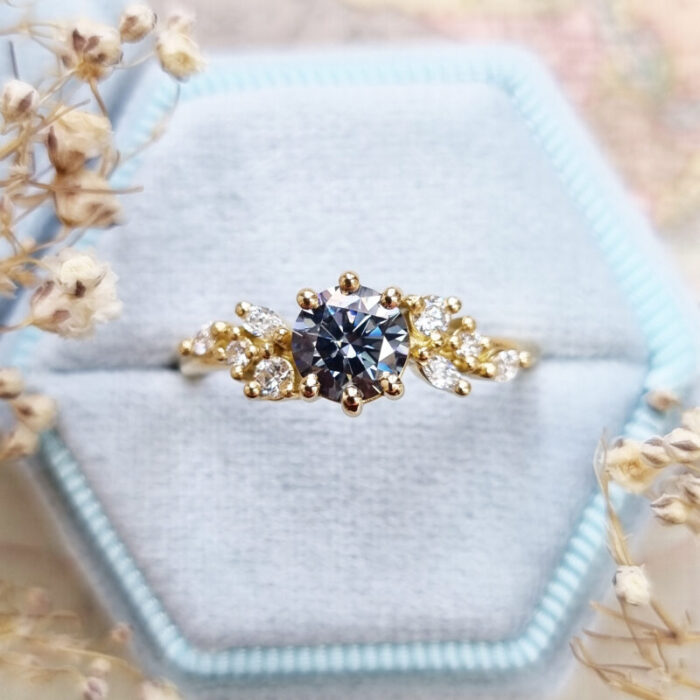 This brand new ring features a mesmerizing round brilliant cut midnight grey moissanite, set with a mixture of marquise and round cut diamonds in a flowing, floral inspired pattern. The ring is designed to be low profile from the finger.