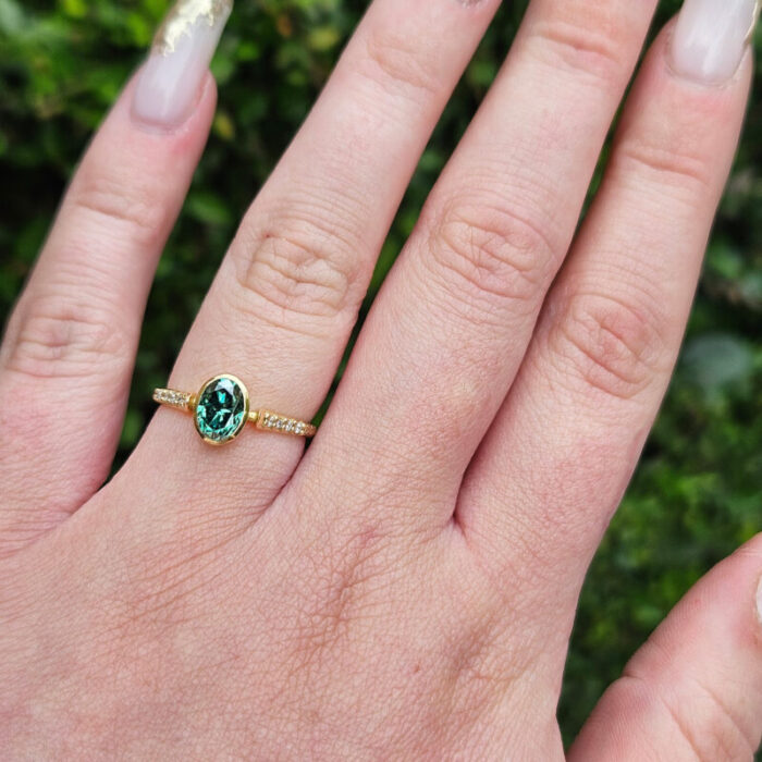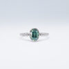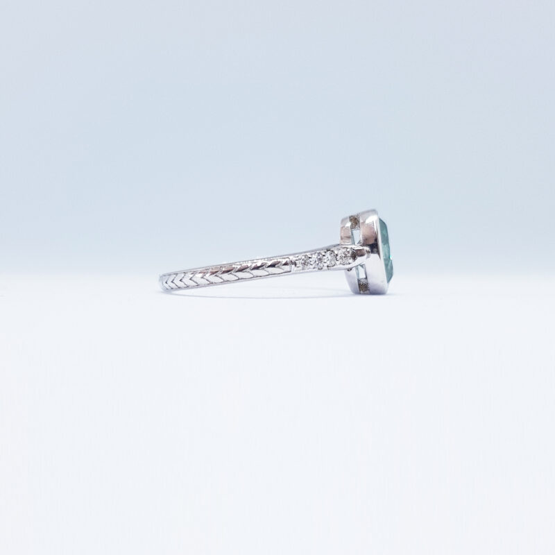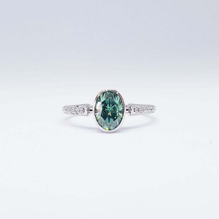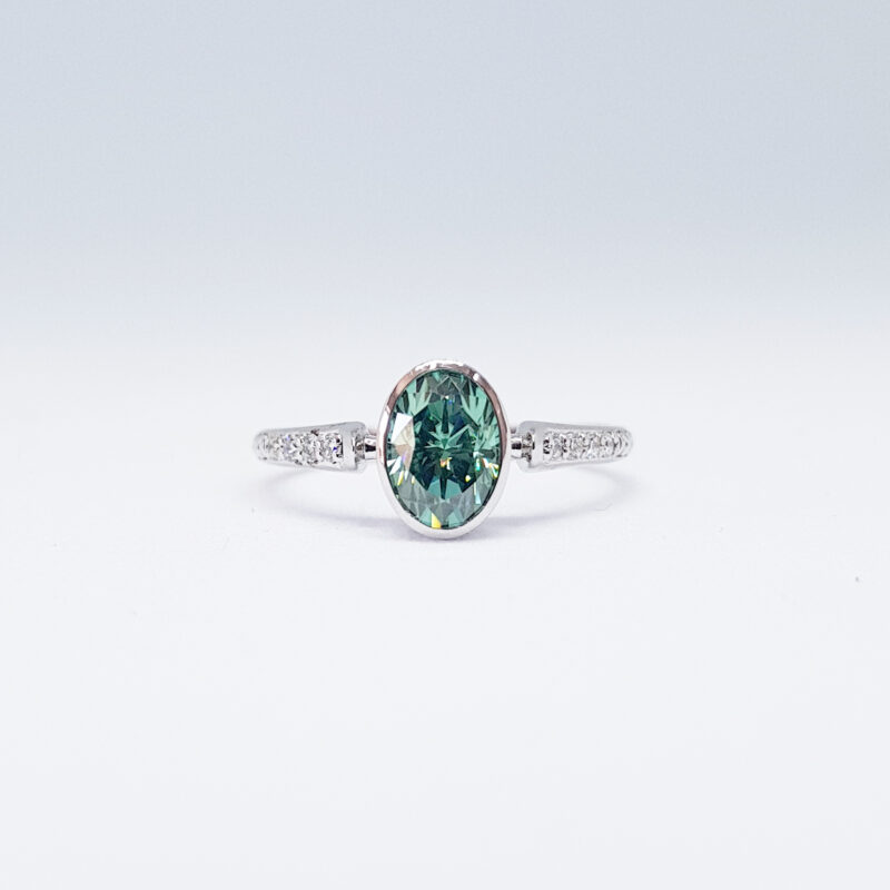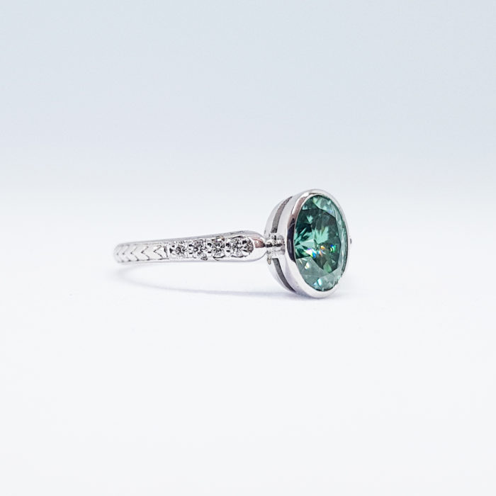 This brand new stunning ring features a central oval cut Mint Moissanite, flanked by eight brilliant cut diamonds in a stunning engraved mount!