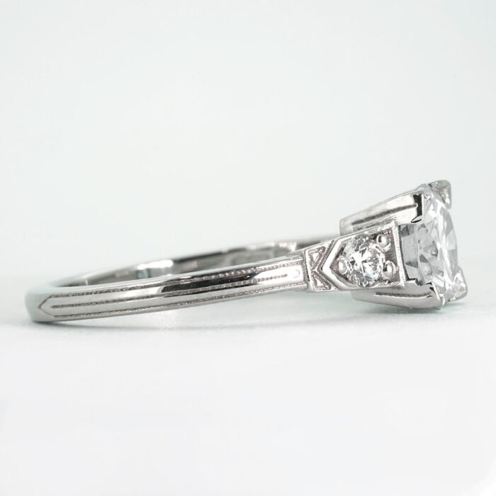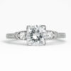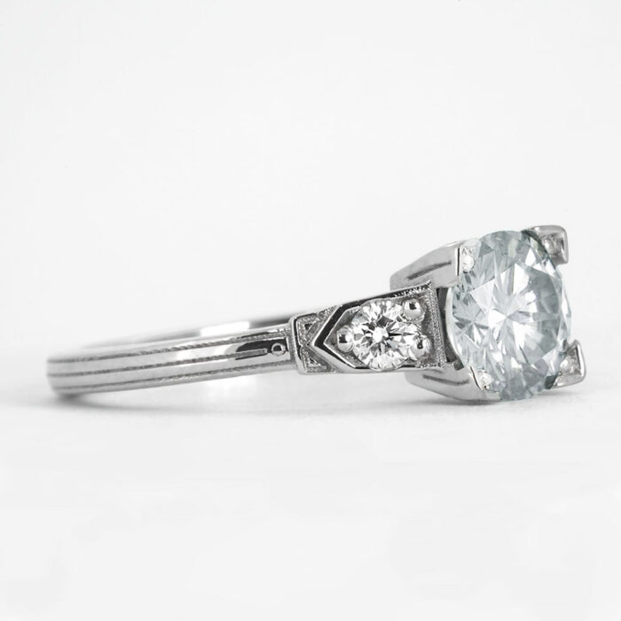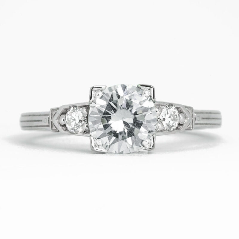 This brand new stunning ring features a central 1 carat brilliant cut white moissanite, flanked by two diamonds in an art deco inspired! The ring is engraved with fine detailing to make it truly unique.