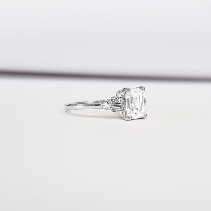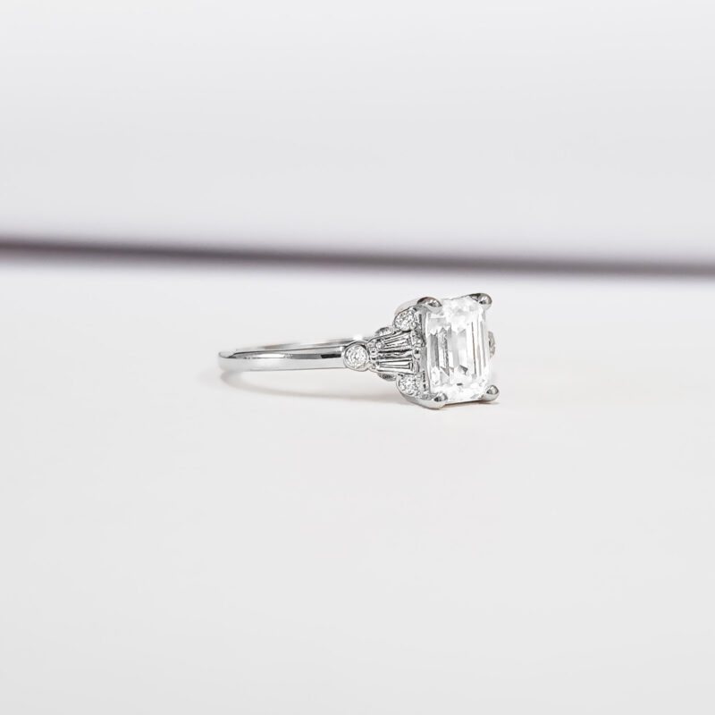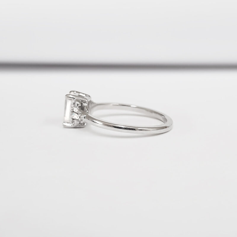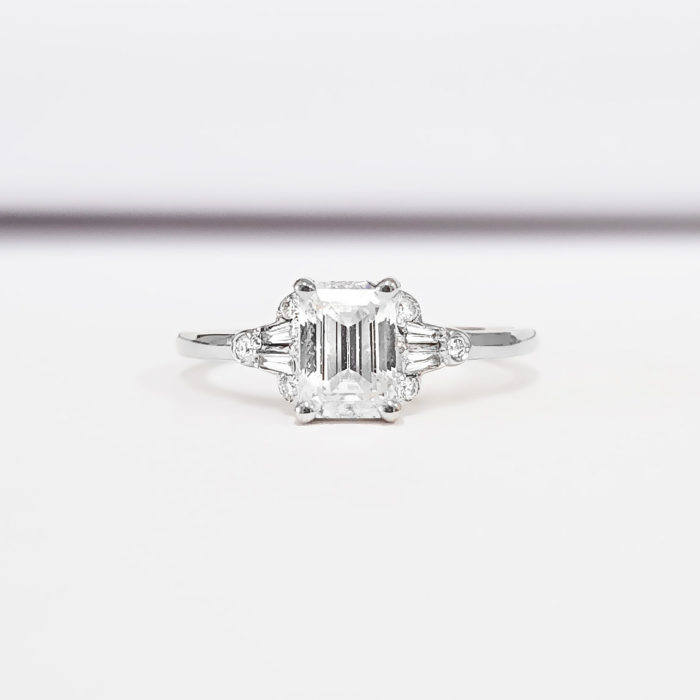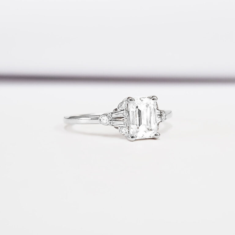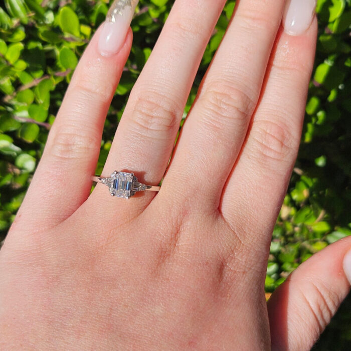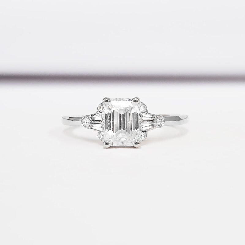 This absolutely gorgeous ring features a dazzling Emerald cut Moissanite, with 4 tapered baguette and 6 brilliant cut diamond accents!