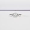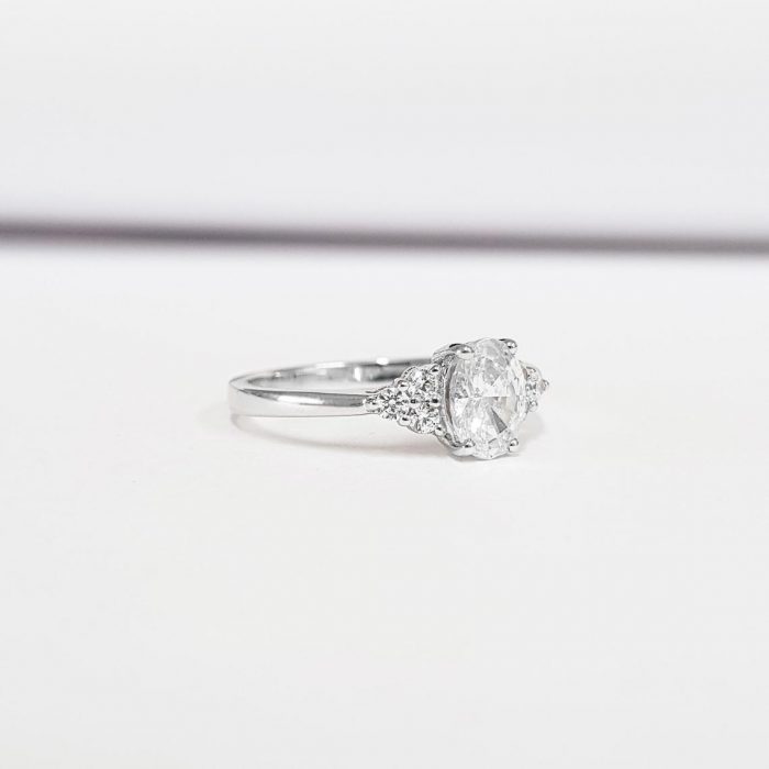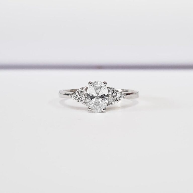 This absolutely gorgeous ring features a dazzling oval Moissanite with 6 diamonds flanking on either side in a gold or platinum mount!