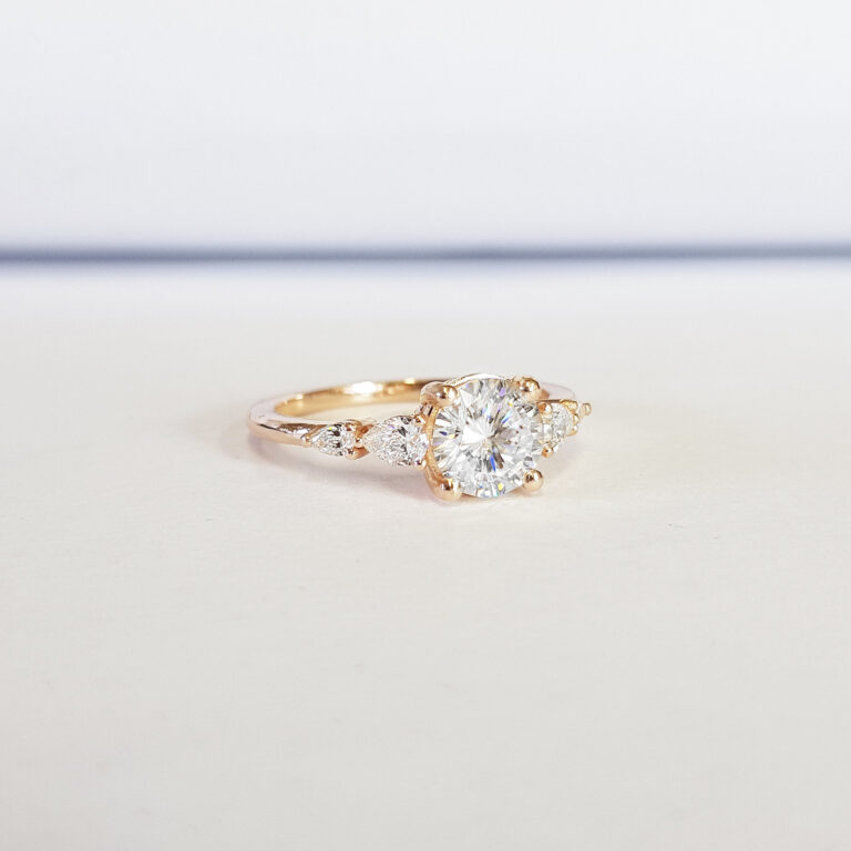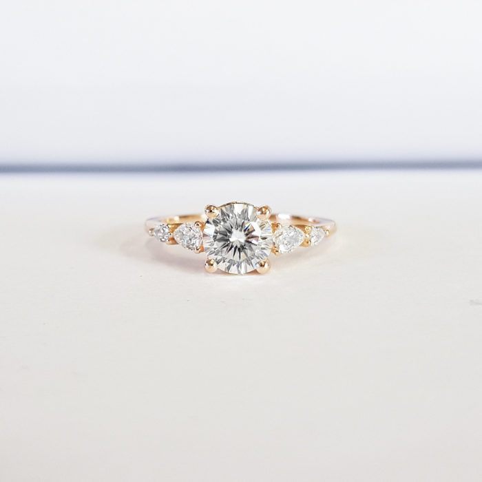 This brand new stunning ring features a central, super bright, brilliant cut hearts and arrows Moissanite, that has been claw set with 4 graduating pear cut diamonds, in a sleek and elegant mount.