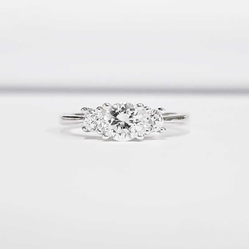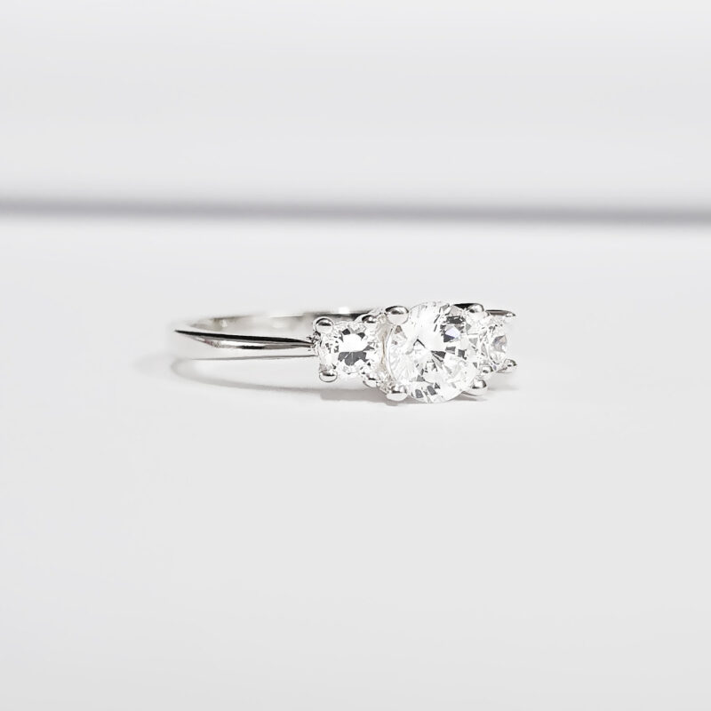 This brand new stunning ring features a central brilliant cut Moissanite, that has been claw set with two smaller brilliant cut moissanites, in a sleek and elegant low profile mount.