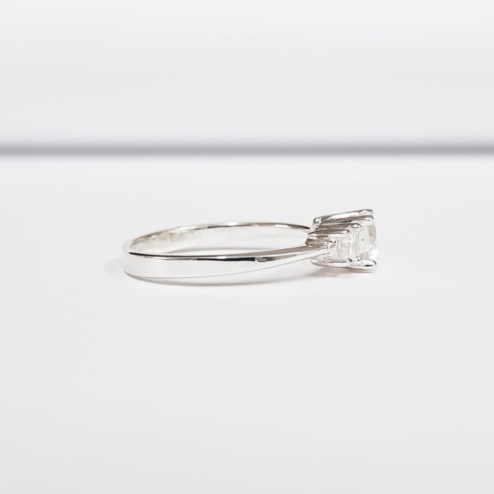 Center Moissanite: 5 mm diameter, 0.5 carats, E/F colour, VVS clarity