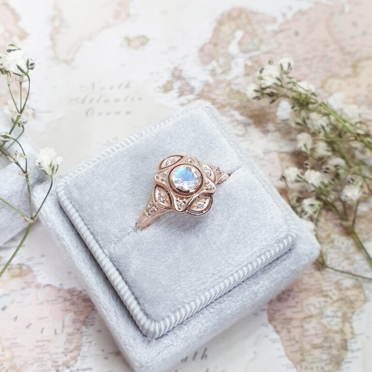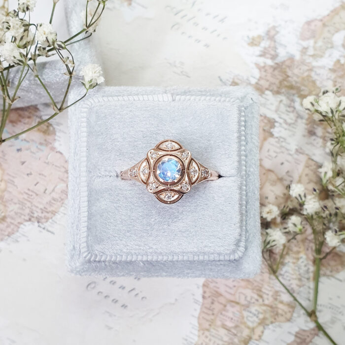 This gorgeous ring features a central round cut natural faceted rainbow moonstone, set with a series of diamonds set in a 1920s inspired mount!