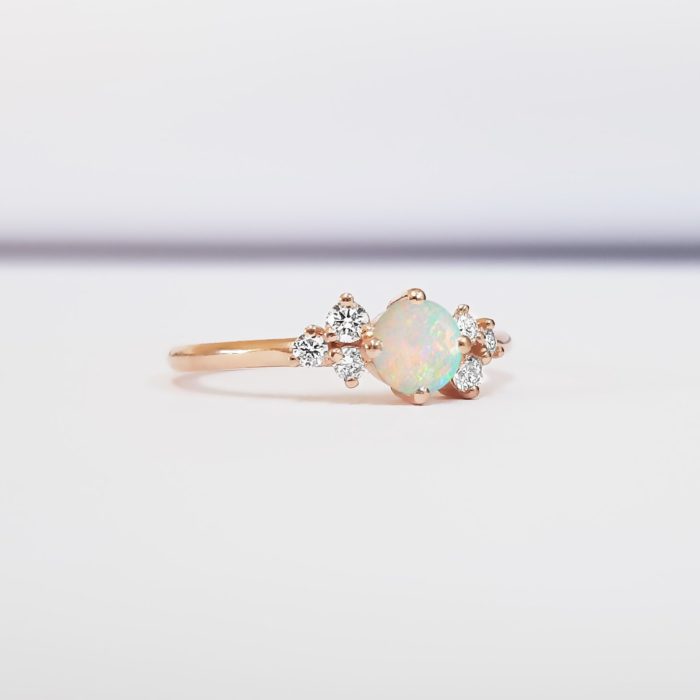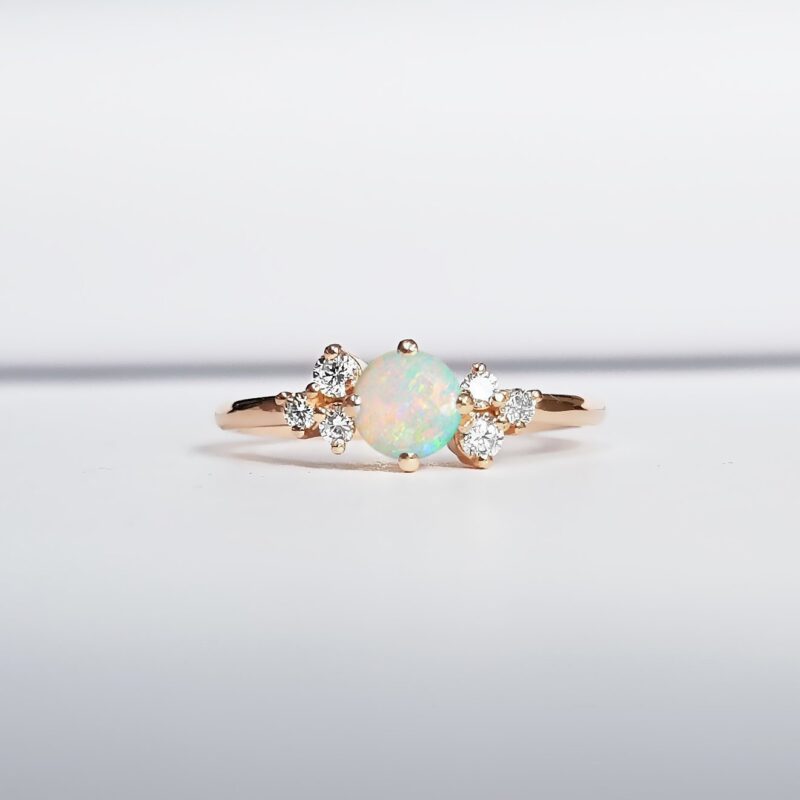 This brand new stunning ring features a central cabochon cut Opal, that has been claw set with 6 brilliant cut diamonds, in a sleek and elegant low profile mount.