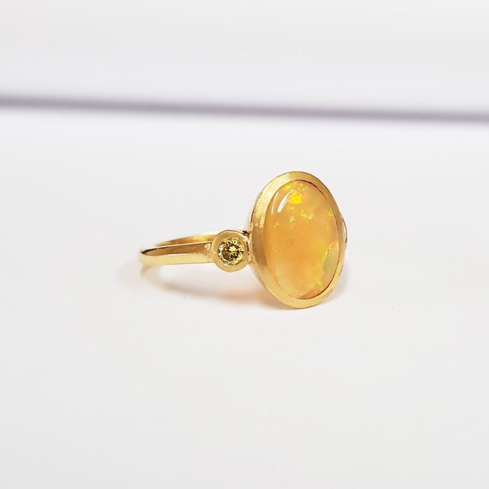 This stunning ring features a totally unique Ethiopian golden Opal, bezel set with two yellow diamonds in a stunning custom made 22 carat yellow gold mount!