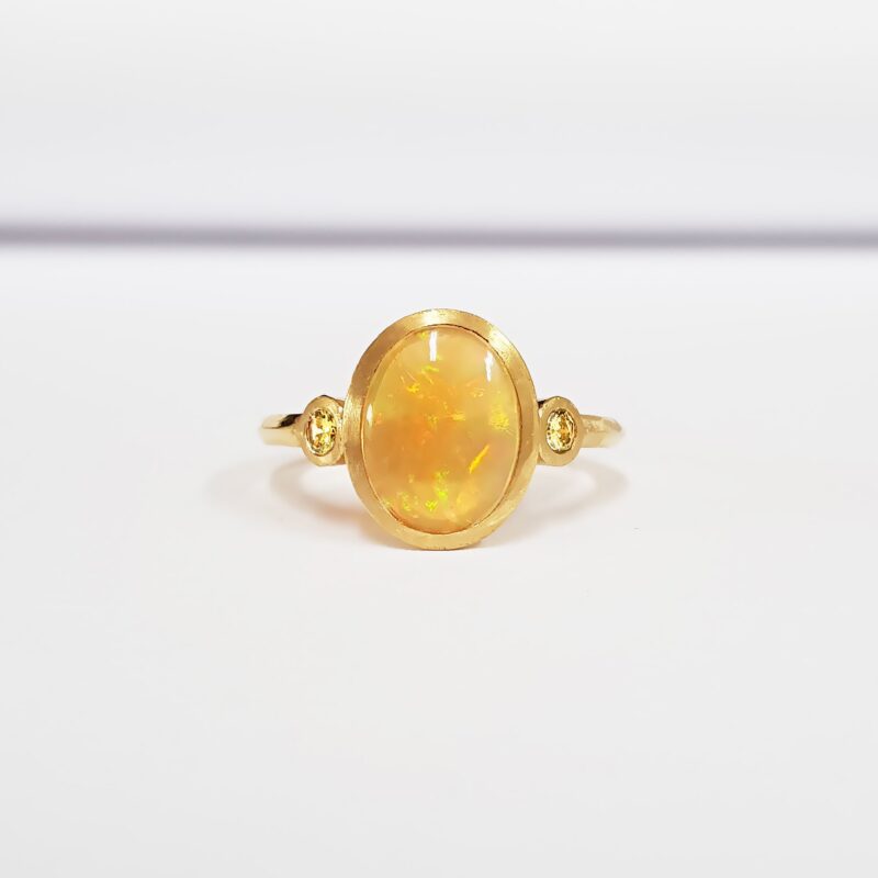 This stunning ring features a totally unique Ethiopian golden Opal, bezel set with two yellow diamonds in a stunning custom made 22 carat yellow gold mount!