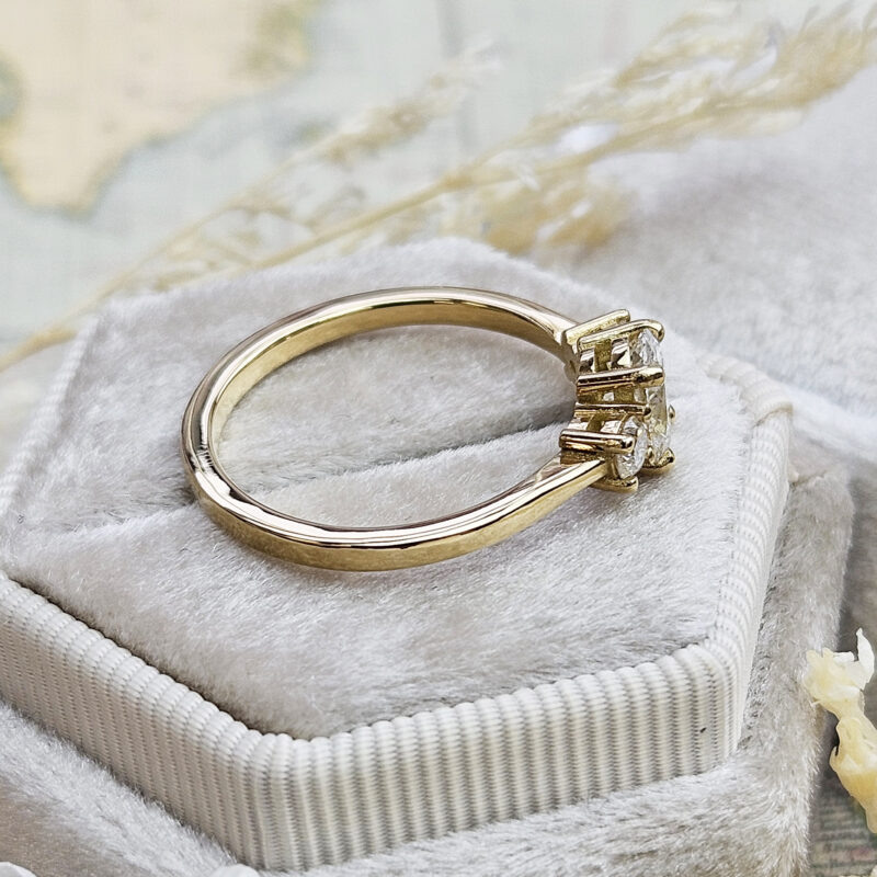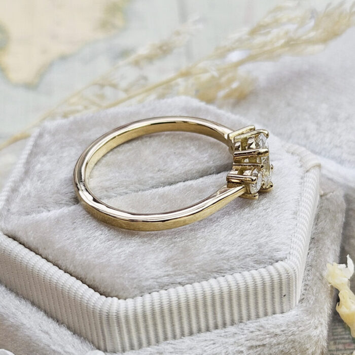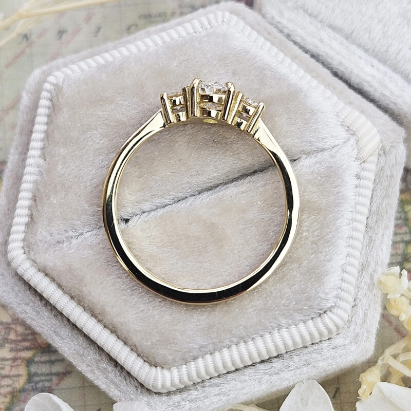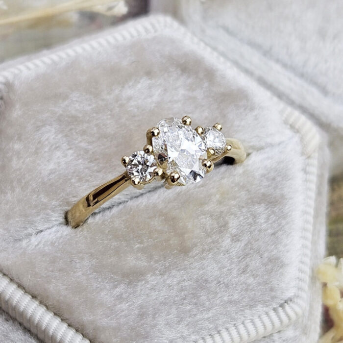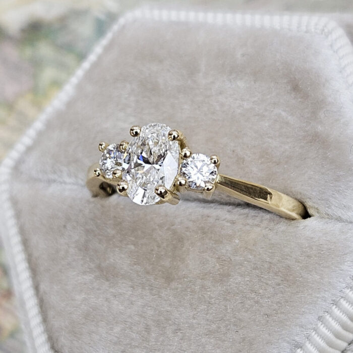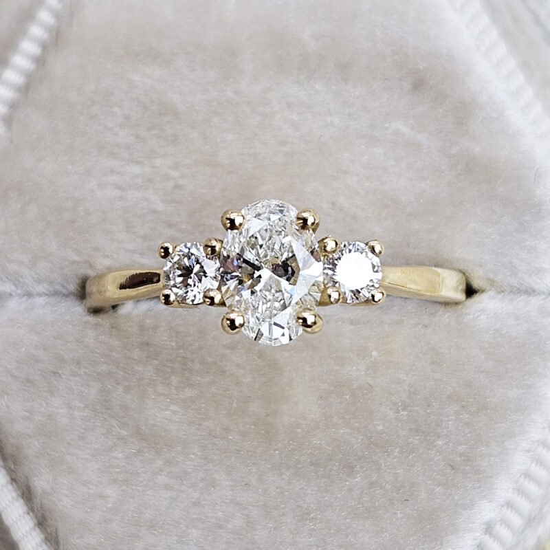 This elegant ring features a central 0.7 carat oval cut lab grown diamond, that has been set between two matching lab grown round brilliant cut diamonds in a low profile 18ct yellow gold mount!