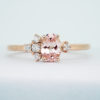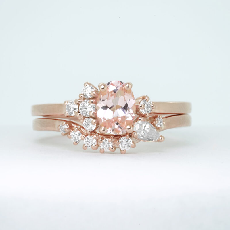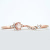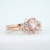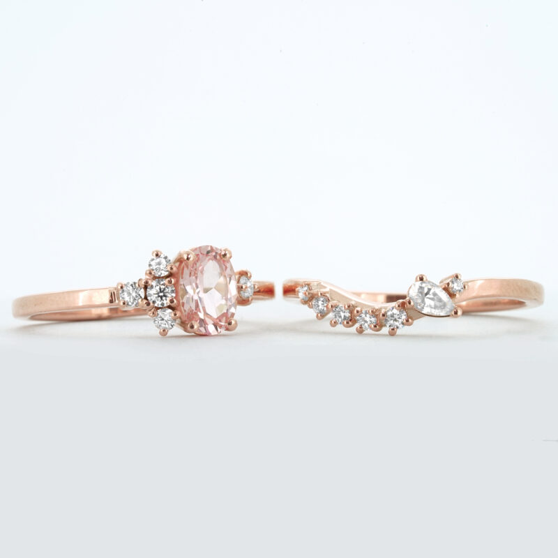 This brand new stunning engagement ring features a central lab created oval cut champagne Sapphire, set in a stunning asymmetrical mount that has been decorated with 5 brilliant cut diamonds! The engagement ring is accompanied by a fitted wedding band that features 6 brilliant cut diamonds and a pear cut also!