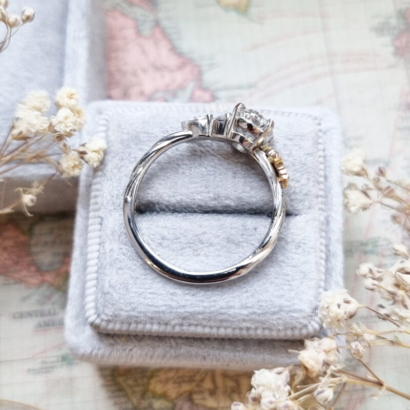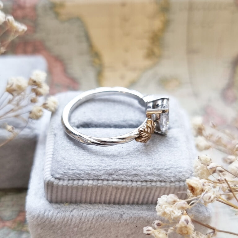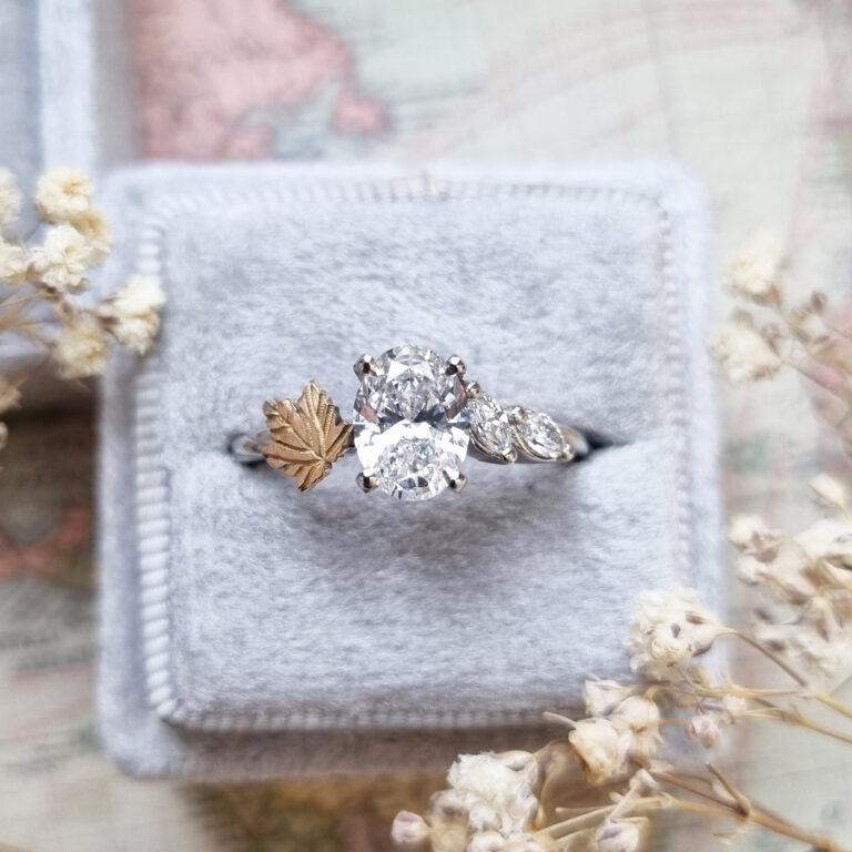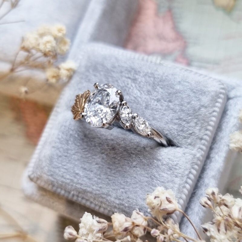 This stunning ring has been inspired by the leaves of a Sycamore tree. It features a central 1.2 carat oval cut lab grown diamond, in a 4 talon setting, that is set between a Sycamore leaf and two cascading marquise lab grown diamonds. The band itself twists like vines. The ring is made in platinum and the leaf in 18ct rose gold for a stunning contrast!