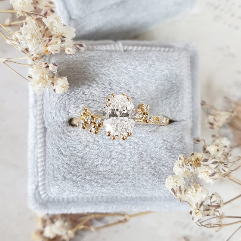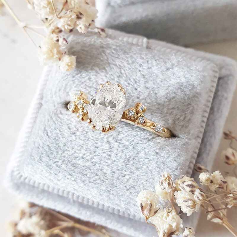 This stunning ring features a central 1 carat oval cut lab grown diamond, set in a cherry blossom inspired 18ct yellow gold mount, that has been studded with accent round and marquise cut diamonds. The ring design is low profile and sleek, in order to sit close to the finger.