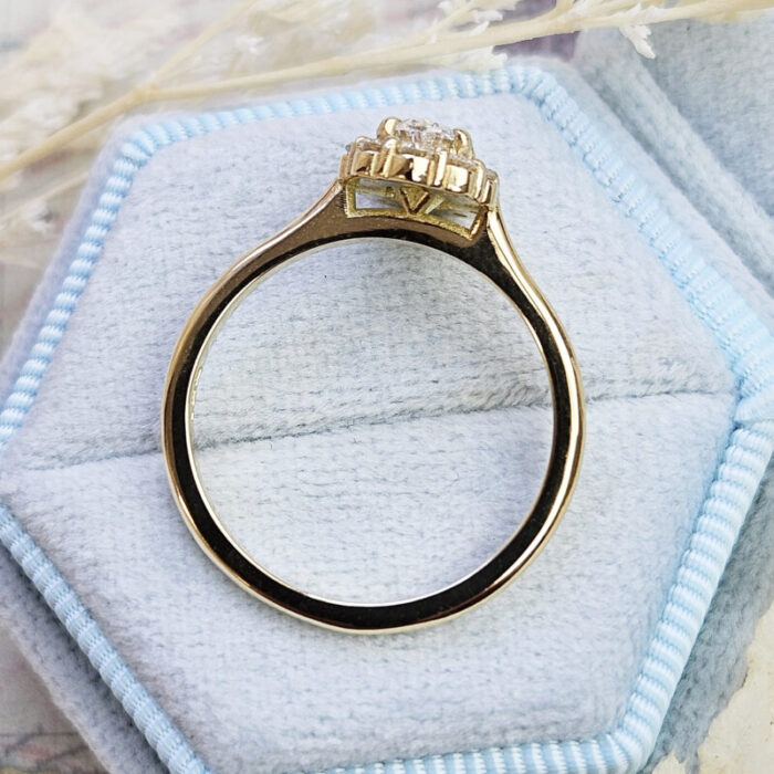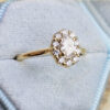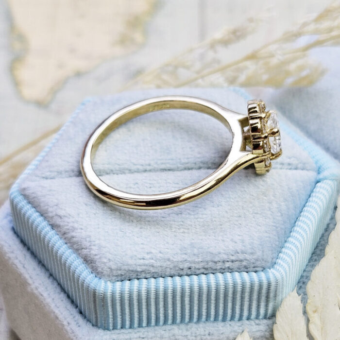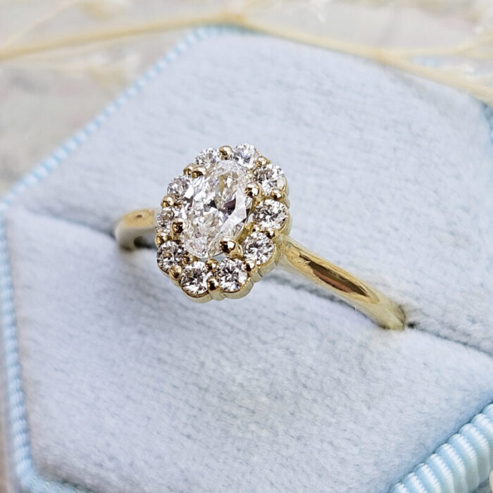 This brand new stunning ring features a central oval lab grown diamond, that has been surrounded with a halo of round brilliant cut lab grown diamonds, in a wedfit profile 18ct yellow gold mount!