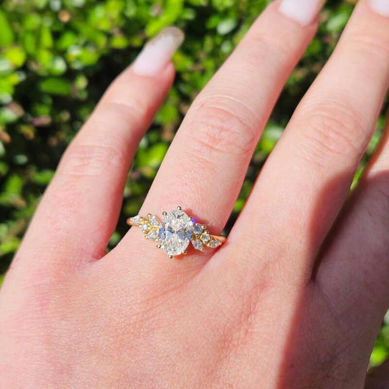This brand new ring features a central 1.5 carat oval cut lab grown diamond, that has been set with a floral mixture of marquise and round cut diamonds, in a 18ct yellow gold, low profile mount!