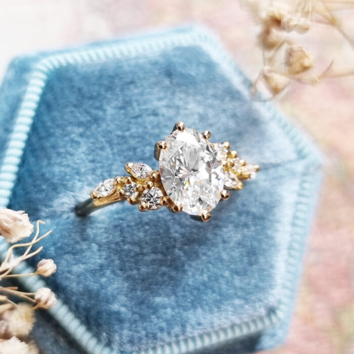 Center Diamond: 1.5ct, oval cut, E colour, VS1 clarity, with IGI certification (this is the minimum size and quality, if the diamond is sourced at a higher size/quality then no extra charge will be added)