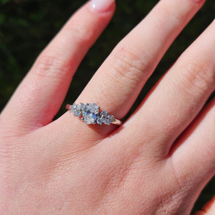 This stunning ring features a central natural 0.7ct oval cut lab grown diamond, that has been prong set with a floral arrangement of marquise and round brilliant cut diamonds, in a low profile platinum mount!