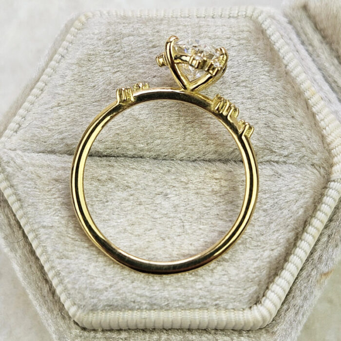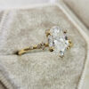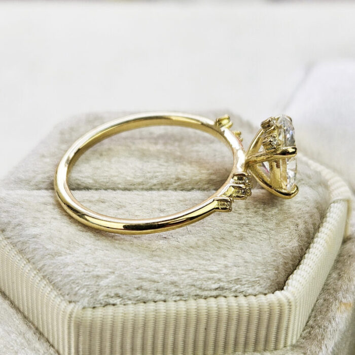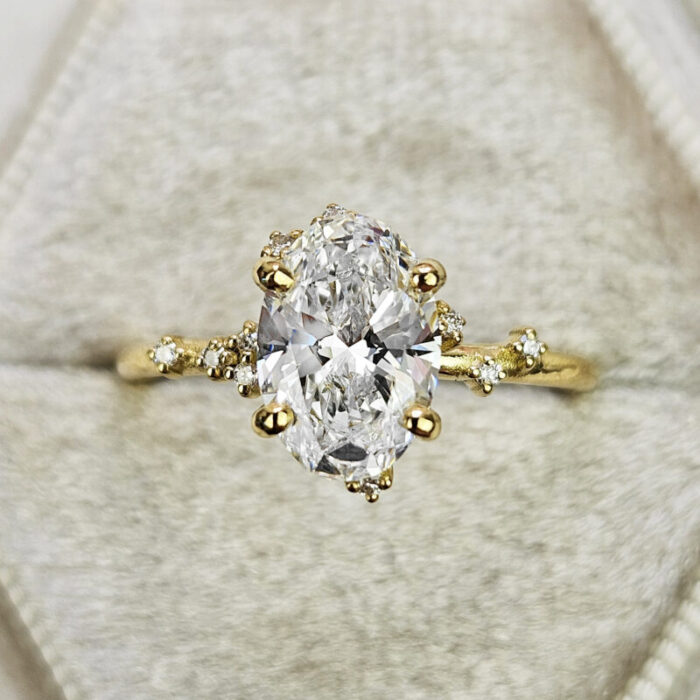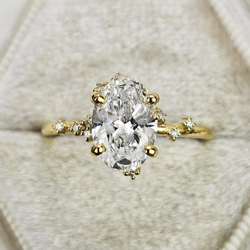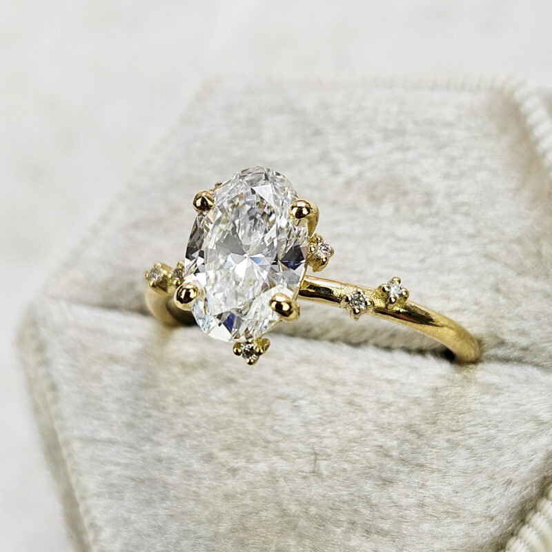 This elegant ring features a central 1.7ct oval cut lab grown diamond, in a 4 prong setting. The ring has been dotted with an asymmetric array of miniature round brilliant cut diamonds, all in 18ct yellow gold!
