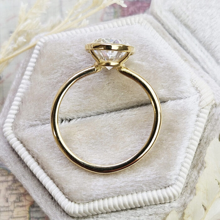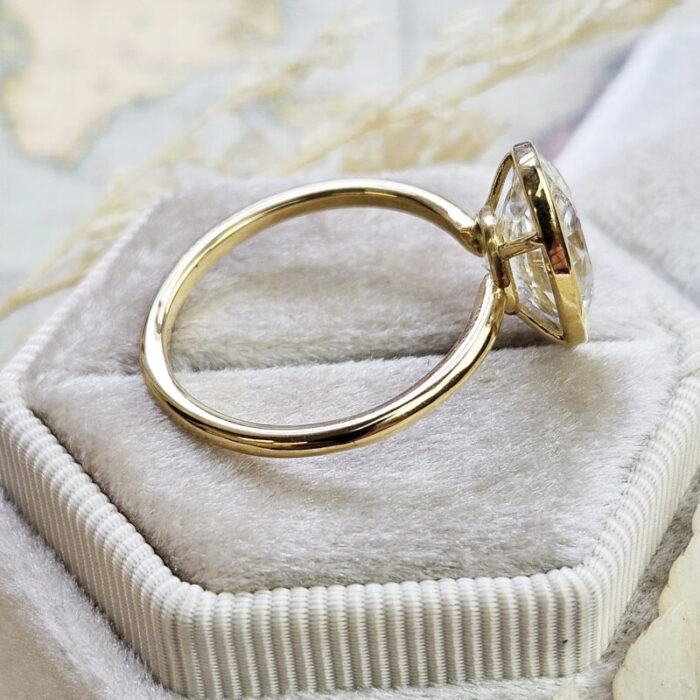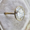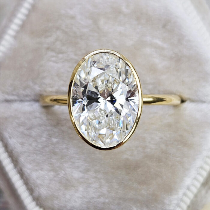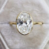 This brand new ring features a central stunning 4.1ct oval cut lab grown diamond. It has been bezel set in a sleek, slim style 18ct yellow gold mount!