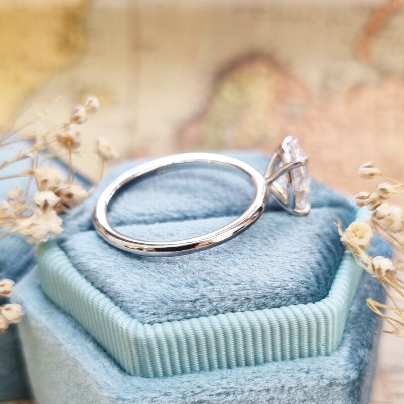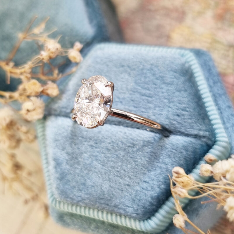 This brand new ring features a central stunning 1.7ct oval cut lab grown diamond. It has been talon set in a sleek, slim style platinum mount!